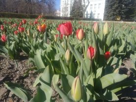 Тут, садівники університету, висадили безліч тюльпанів, перетворивши територію перед головним корпусом на справжнє тюльпанове поле. Зараз бутони цих красивих квітів тільки починають розпускатися, але вже зараз клумба підвищує настрій перехожим.