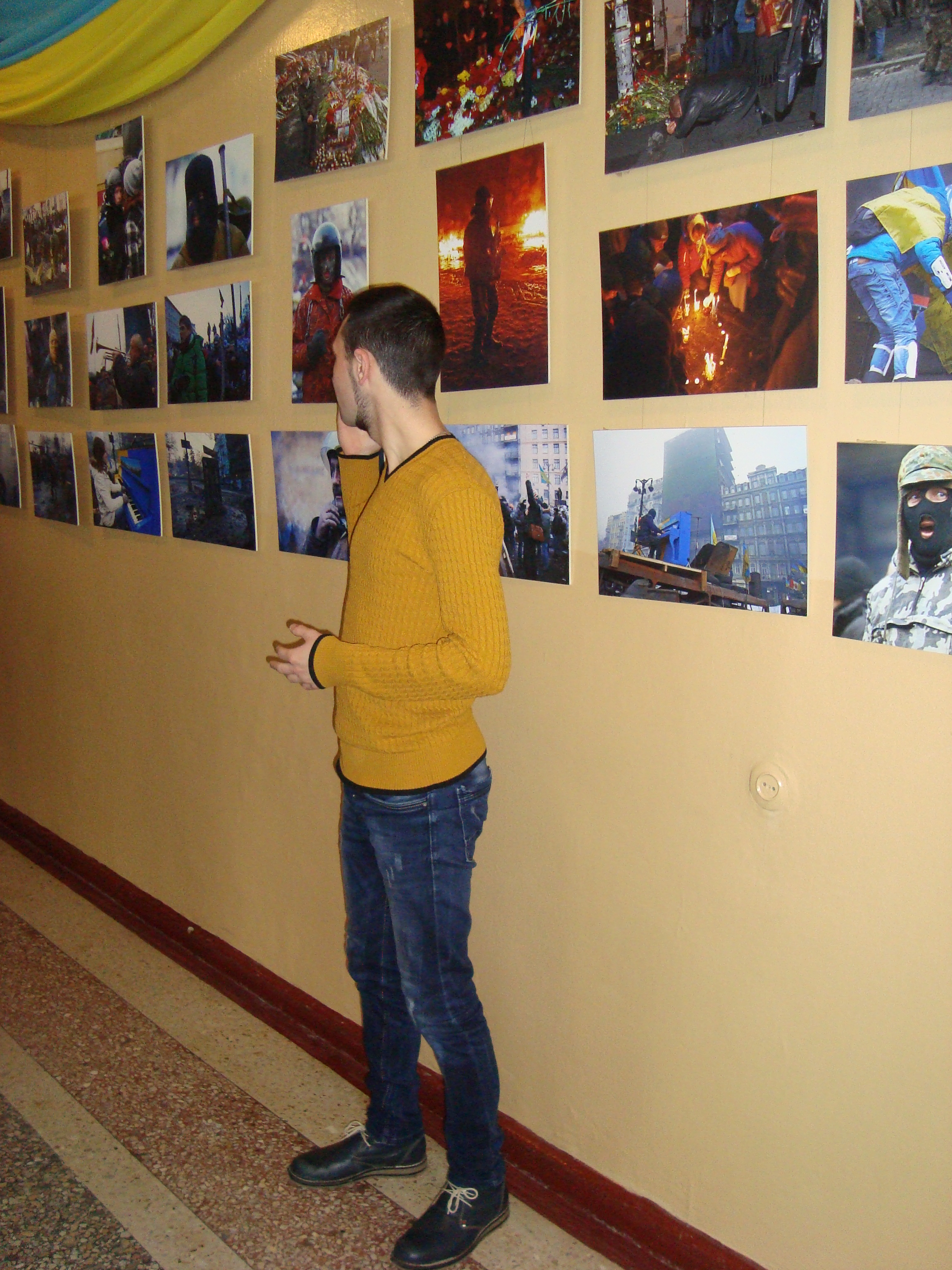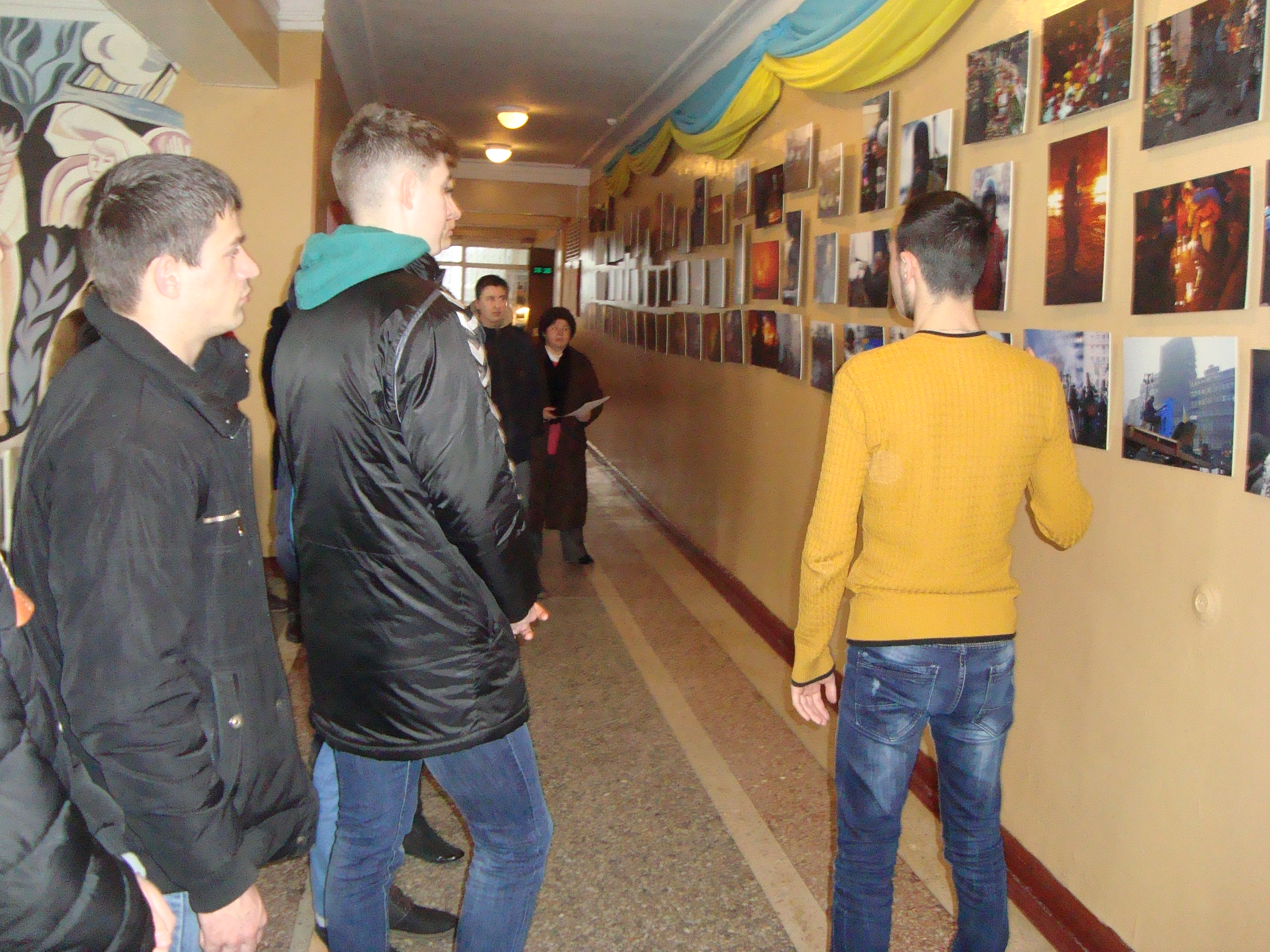 На виставці представлено близько 70 робіт фотографа. Знімки подорожують по всій Україні. До нас вони прибули із Запоріжжя. Роботи розміщено у великій залі БК ім. Шевченка. Подивитися фотографії і вшанувати пам’ять Героїв Небесної сотні прийшли студенти 11 ЕЕ,під керівництвом викладачів кафедри суспільно-гуманітарних наук Шелудько О.О. та Щербаковою Н.В.