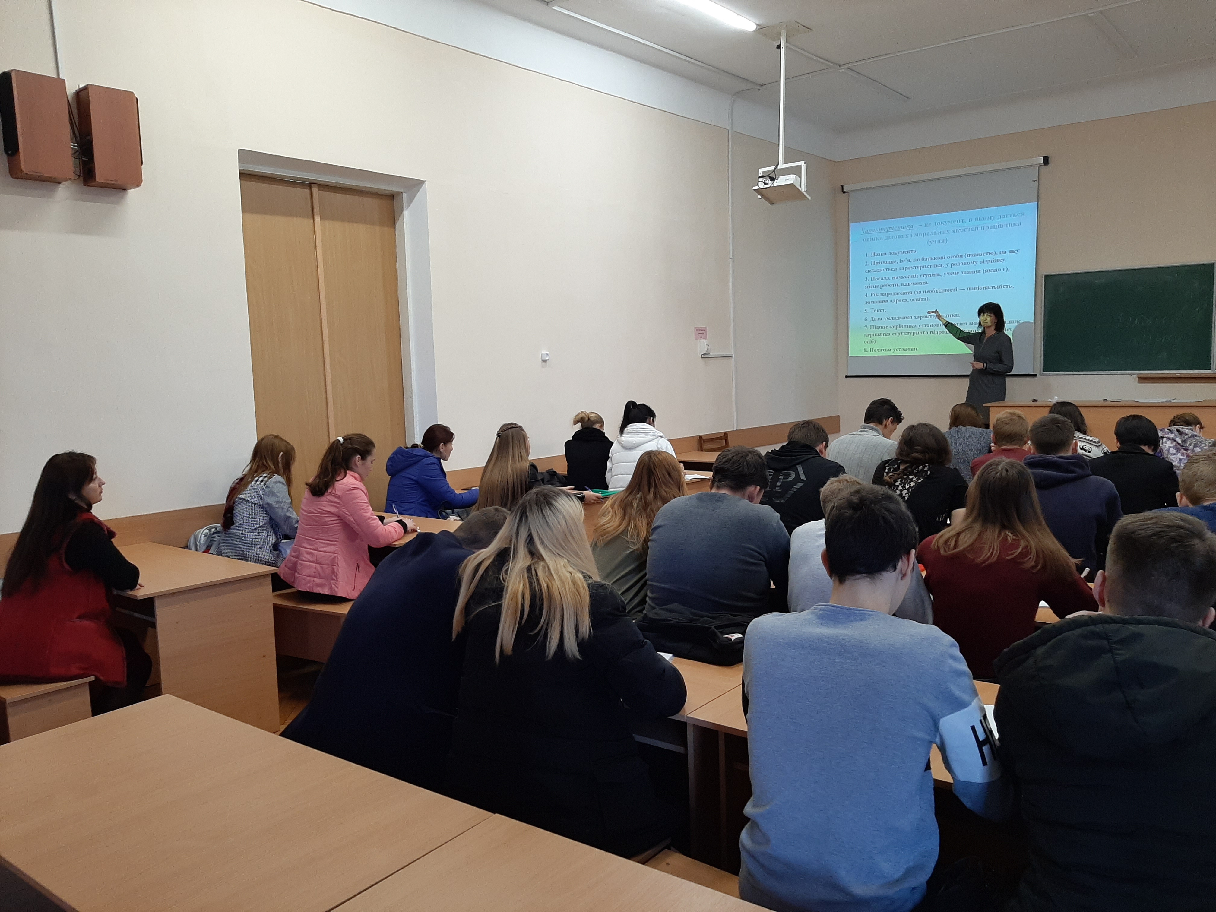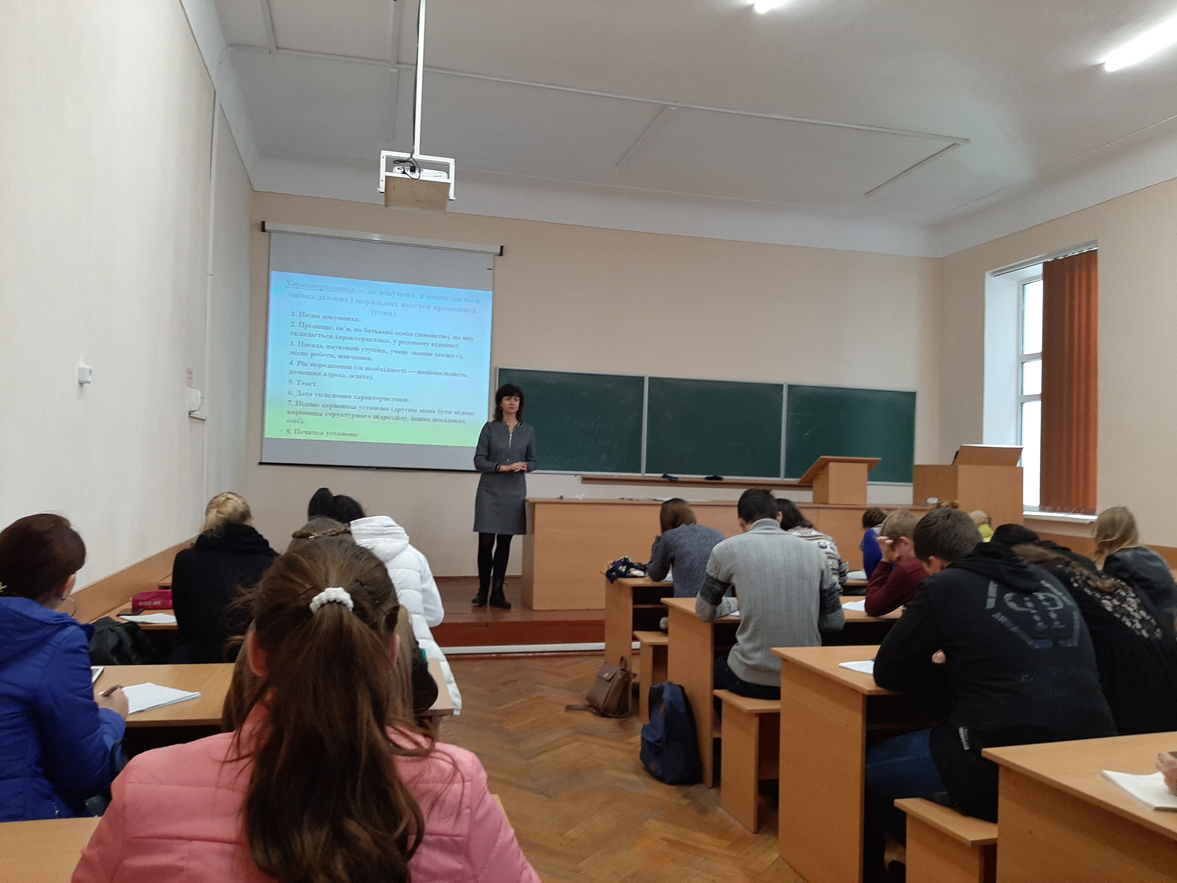 31 жовтня доцентом кафедри суспільно-гуманітарних наук Максимець О.М. було проведено відкриту лекцію з дисципліни «Українська мова за професійним спрямуванням» на тему: «Ділові папери як засіб писемної професійної комунікації. Кадрово-контрактна документація» для студентів першого курсу, що навчаються за спеціальністю «Харчові технології» та «Готельно-ресторанна справа».
