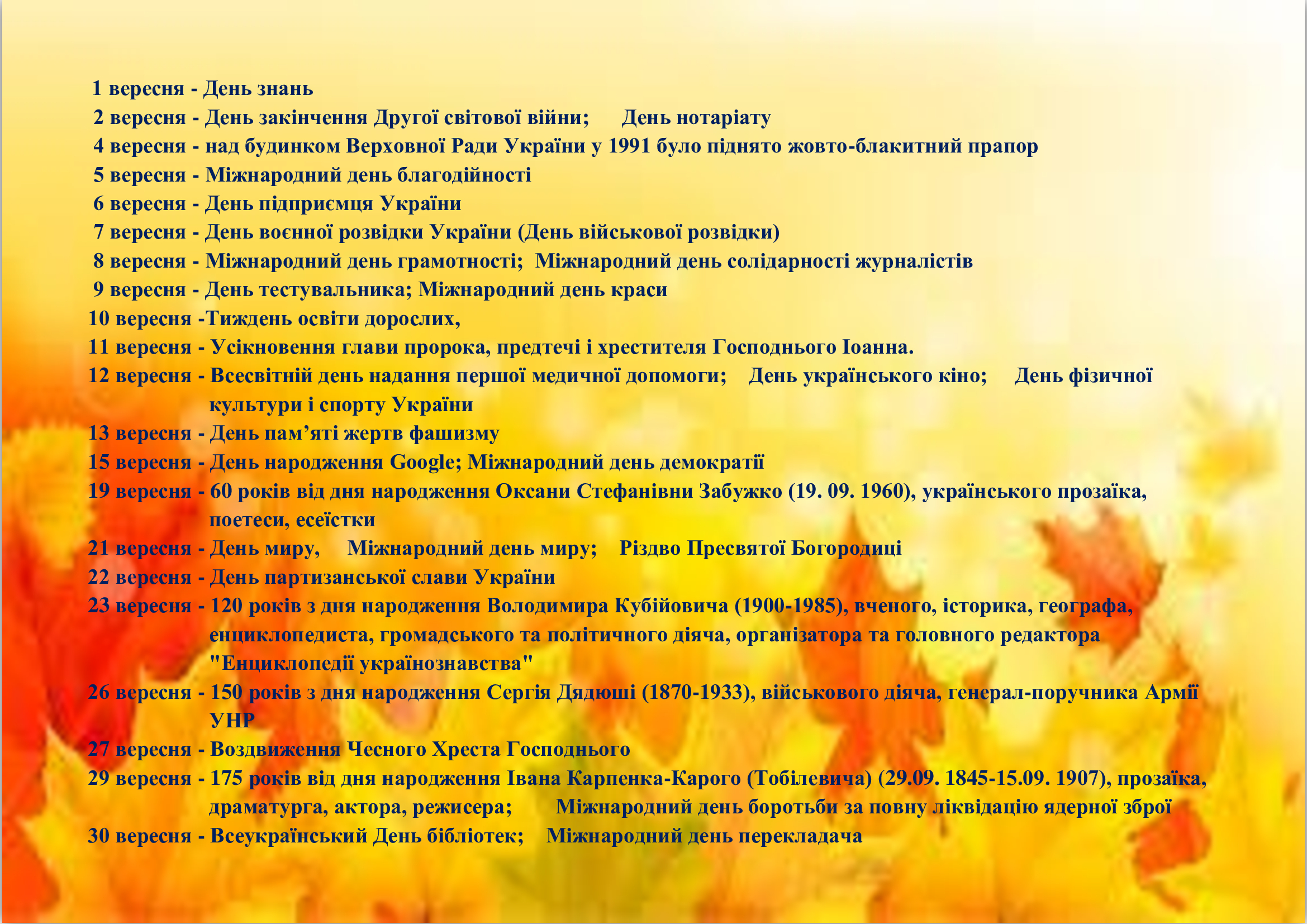 КАЛЕНДАР ЗНАМЕННИХ І ПАМ’ЯТНИХ ДАТ НА ВЕРЕСЕНЬ