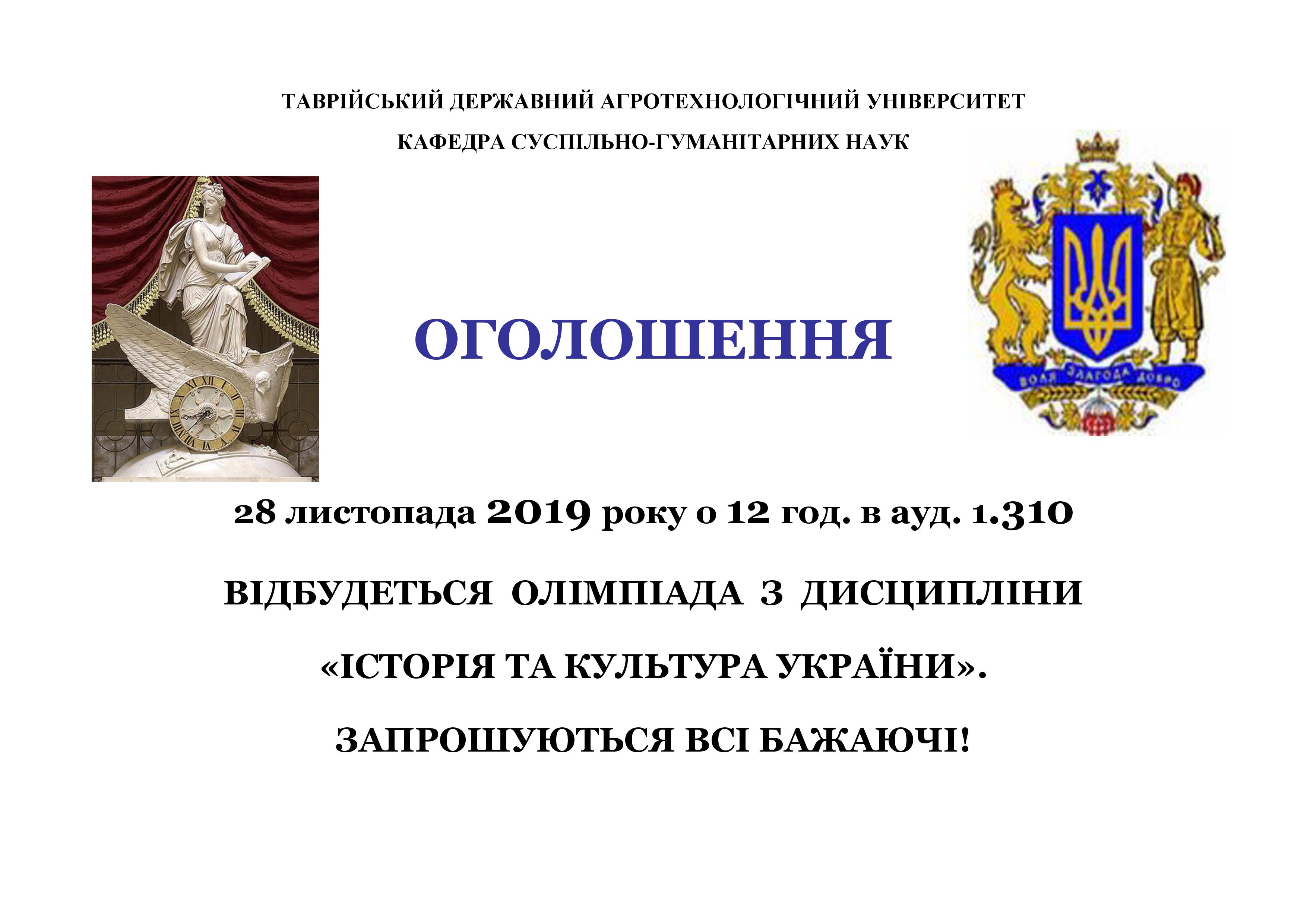 ОГОЛОШЕННЯ. ОЛІМПІАДА З ДИСЦИПЛІНИ «ІСТОРІЯ ТА КУЛЬТУРА УКРАЇНИ»