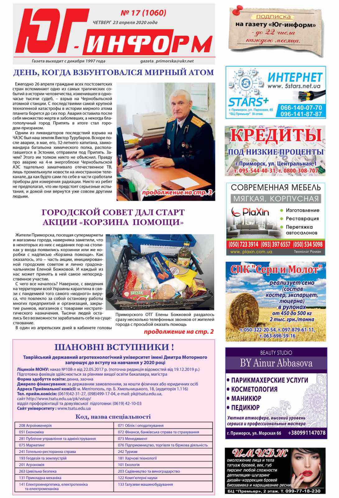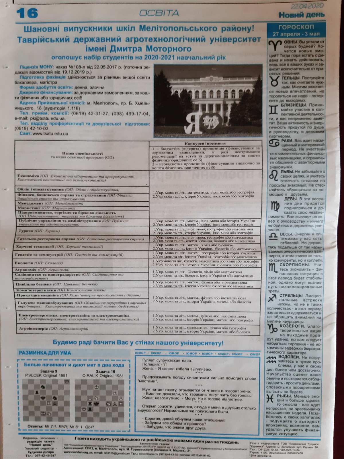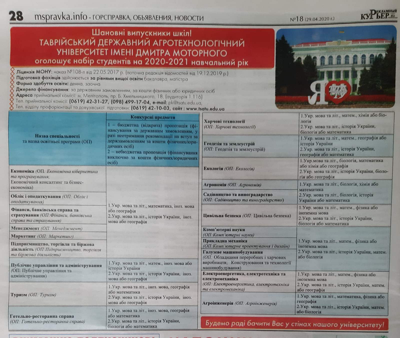 Одним із пріоритетних завдань кафедри суспільно-гуманітарних наук ТДАТУ є профорієнтаційна робота. І вона не припиняється ні на мить. У час карантину ми об’єдналися з кафедрами ТСС в АПК, рослинництва, іноземних мов та садівництва і виноградарства з однією метою – активізувати цю роботу. Тому у засобах масової інформації Мелітопольського, Приморського та Веселівського районів розмістили рекламні оголошення щодо вступної кампанії 2020 р. у нашому Таврійському державному агротехнологічному університеті імені Дмитра Моторного. А іще кафедра розмістила таку ж інформацію на сайтах усіх закріплених за кафедрою шкіл.