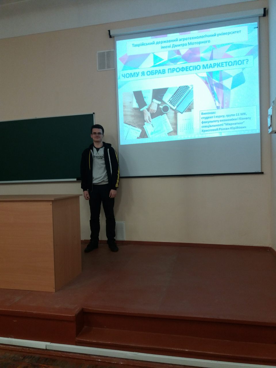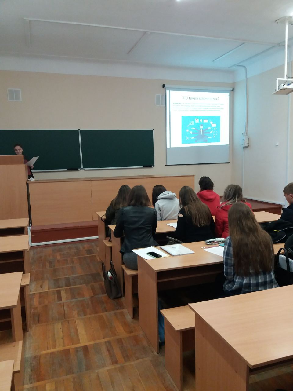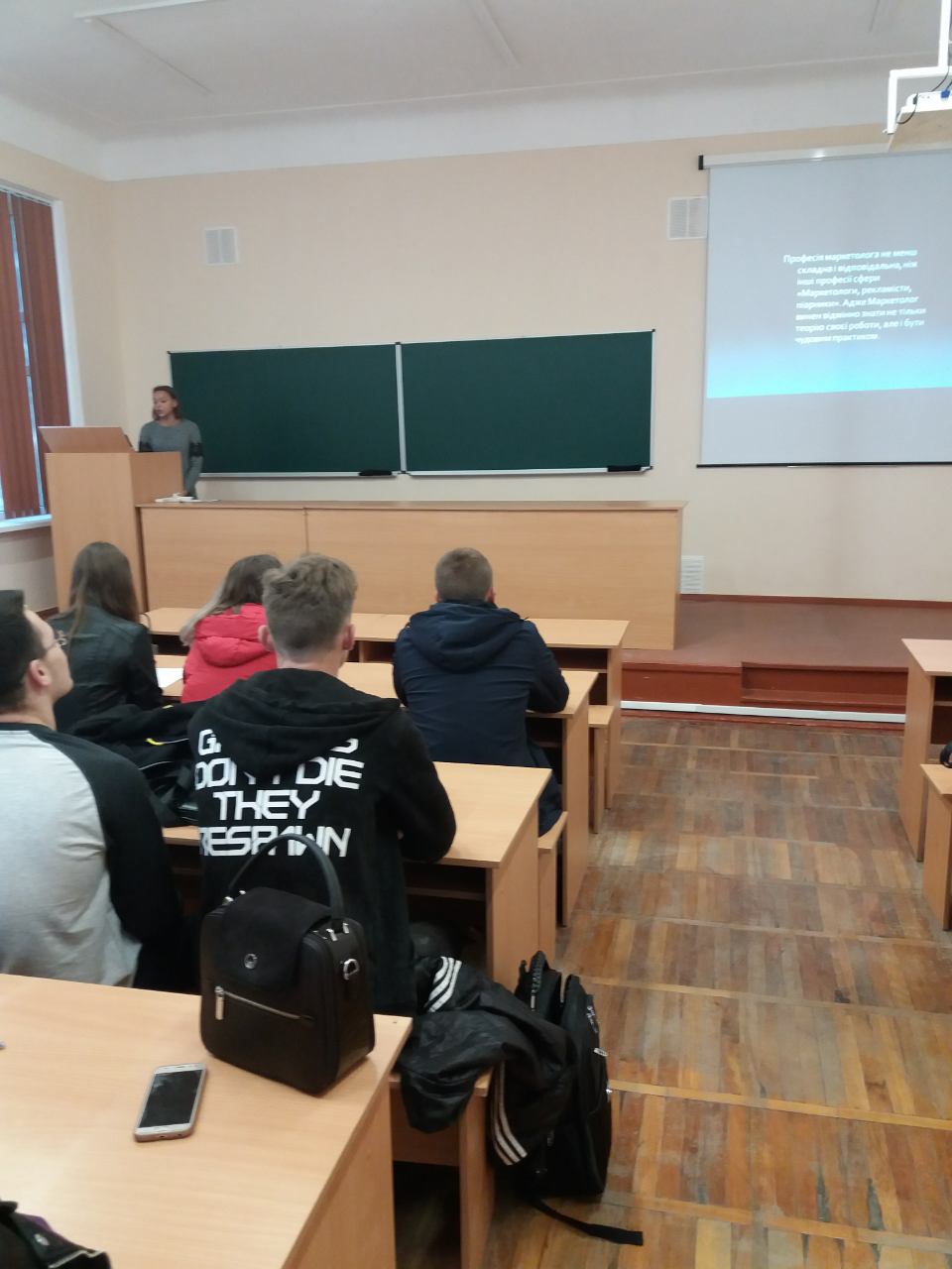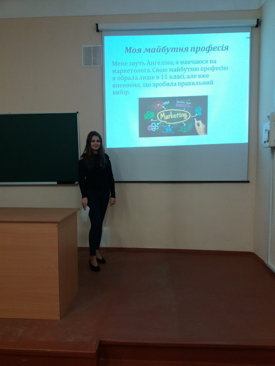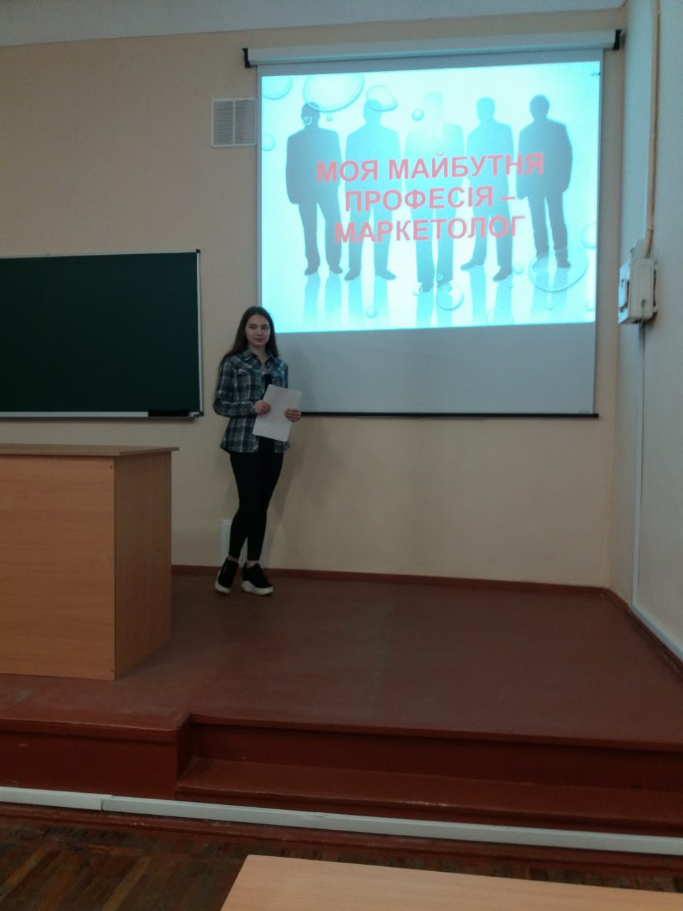 IMG-79eab112a1d31fa9db94fc780efaf1d0-V   Важливою складовою професійної діяльності майбутніх маркетологів є комунікативна компетенція, а саме володіння технікою спілкування, уміння виступати публічно, вести діалог. І саме з метою розвитку таких здібностей студенти 11 групи спеціальності «Маркетинг» сьогодні захищали самостійну роботу із навчальної дисципліни «Українська мова за професійним спрямуванням». Перед ними стояло завдання підготувати доповідь із презентацією про професію, яку вони опановують в університеті. При цьому потрібно було дати відповідь на питання: