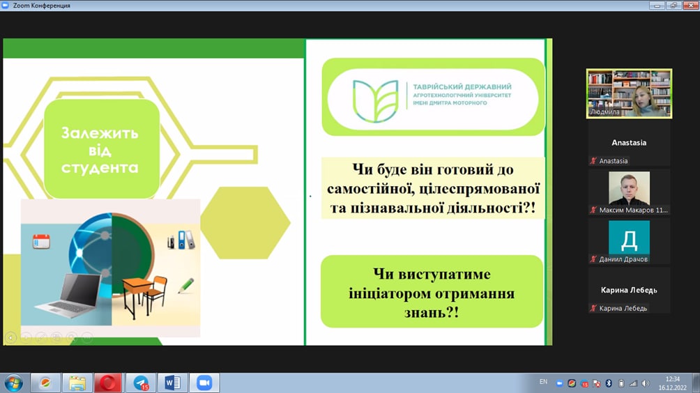 16 грудня 2022 р. в межах Вищої школи педагогічної майстерності відбувся онлайн-семінар «Дистанційне навчання як окремий фрагмент в організації освітнього простору» для здобувачів вищої освіти Таврійського державного агротехнологічного університету імені Дмитра Моторного.