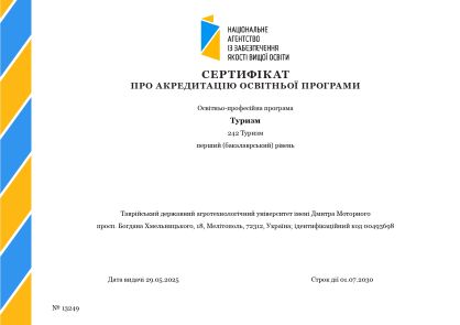 У 2024 – 2025 навчальному році освітньо-професійні програми Таврійського державного агротехнологічного університету імені Дмитра Моторного пройшли повні акредитації. Перед науковцями кафедри економіки і бізнесу було поставлене завдання щодо підготовки до повної акредитації двох освітньо–професійних програм «Економічний консалтинг та бізнес – економіка» та «Туризм».