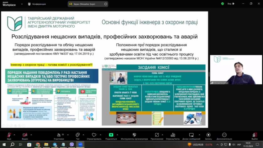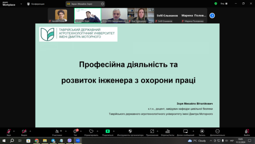 11 грудня 2024 року на платформі ZOOM за сприяння Науково-методичного центру професійно-технічної освіти відбувся обласний семінар відповідальних осіб з охорони праці закладів професійної (професійно-технічної) освіти у Запорізькій області за темою “Організація роботи інженера з охорони праці. Розвиток компетенцій, підвищення кваліфікації, самоосвіта”. До участі в семінарі був запрошений завідувач кафедри цивільної безпеки ТДАТУ, к.т.н., доцент Михайло Зоря.