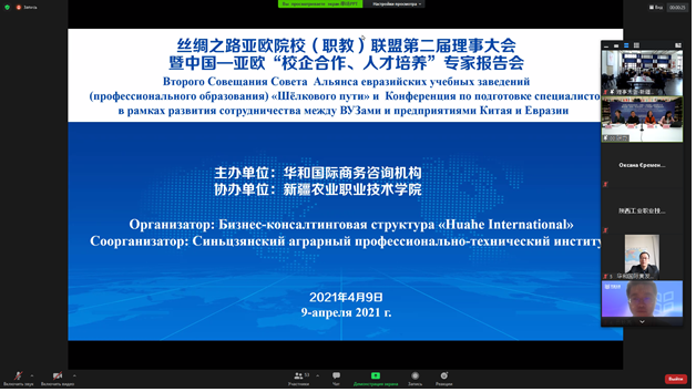 9 квітня в онлайн режимі відбулася нарада ради синьцзянського Альянсу європейських навчальних закладів (професійної освіти) «Шовкового шляху» та конференція з підготовки фахівців в рамках розвитку співробітництва між закладами вищої освіти і підприємствами Китаю та Євразії.