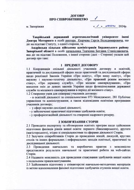 В рамках ділової зустрічі з Богданом Ткаченком – начальником Андрівської сільської воєнної адміністрації Бердянського району Запорізької області та Сергієм Кюрчевим – ректором Таврійського державного агротехнологічного університету імені Дмитра Моторного відбулось підписання договору про співпрацю з подальшим підвищенням кваліфікації та проходження навчальної практики здобувачами за освітніми програмами: «Публічне управління та адміністрування» та «Менеджмент».