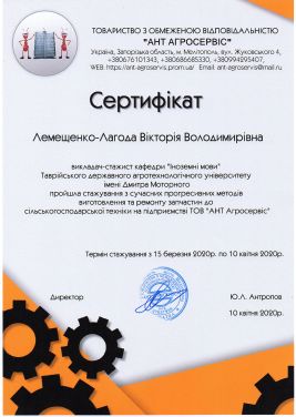 Відповідно до затвердженого плану-графіку стажування викладач-стажист кафедри «Іноземні мови» Вікторія Лемещенко-Лагода з 16 березня по 10 квітня проходила стажування у ТОВ «АНТ Агросервіс». ТОВ «АНТ Агросервіс» є одним з провідних підприємств нашого регіону. У 2018 р. компанія отримала Золото рейтингу серед господарських товариств України у номінації «Результативність та рентабельність» за основним видом діяльності (КВЕД – 28.30).