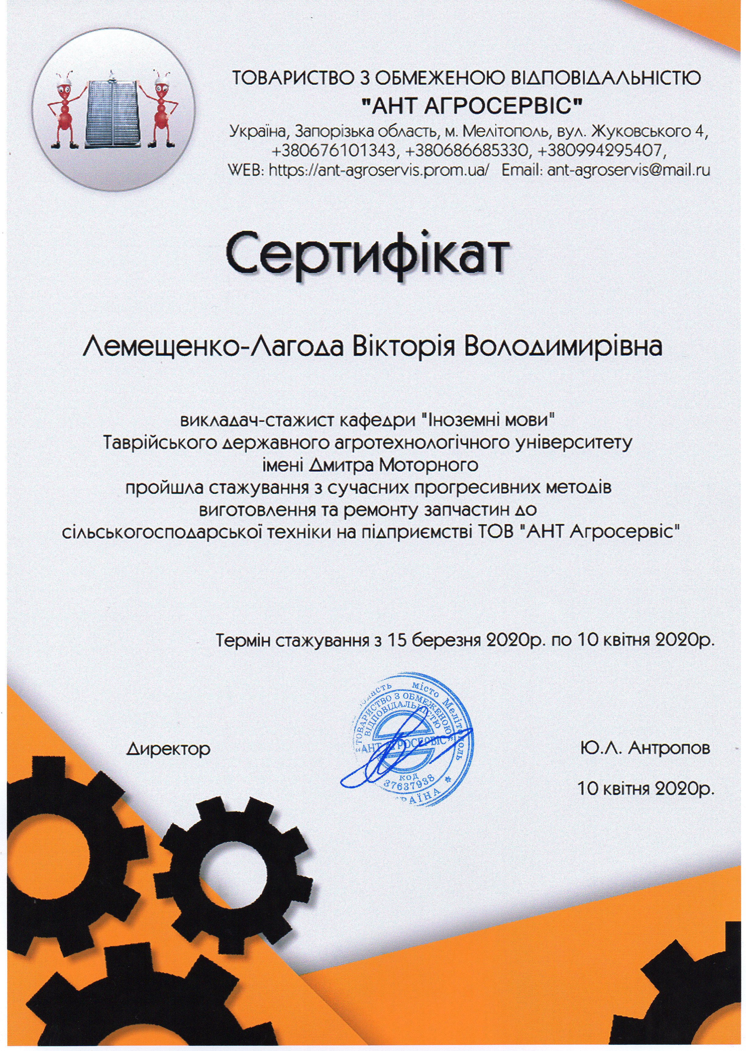 Стажування викладача-стажиста кафедри «Іноземні мови» ТДАТУ на підприємстві ТОВ «АНТ Агросервіс»