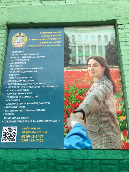 Наприклад, дізнатися про спеціальності, яким навчають у Таврійському державному агротехнологічному університеті імені Дмитра Моторного тепер можна крокуючи вулицями нашого міста. Вже декілька років поспіль на розі вулиць Інтеркультурної та Б.Хмельницького красується білборд, який запрошує вступати у Таврйський ДАТУ.