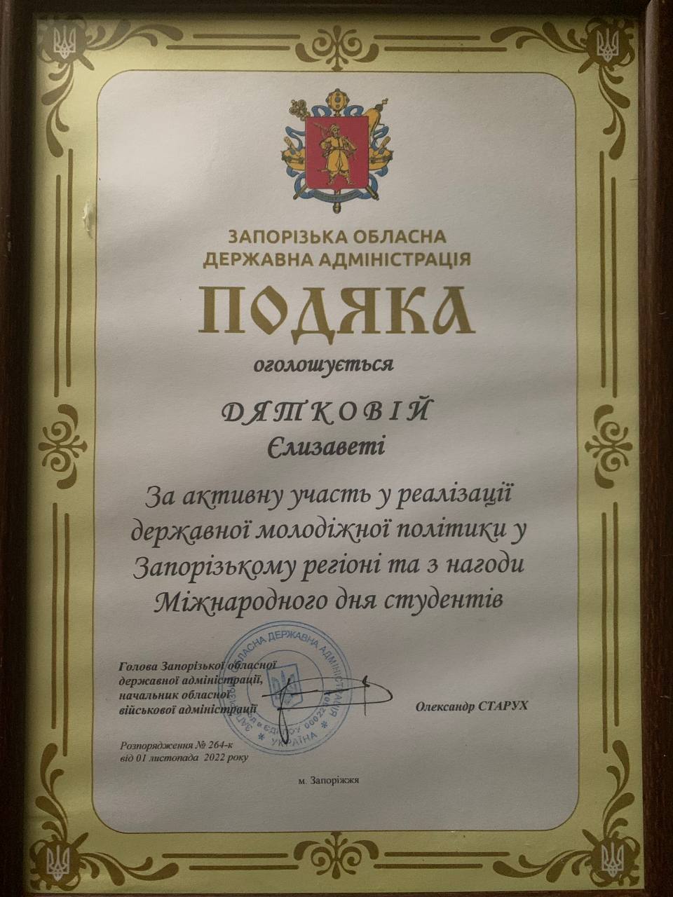 Студентка ТДАТУ отримала Подяку ЗОДА
