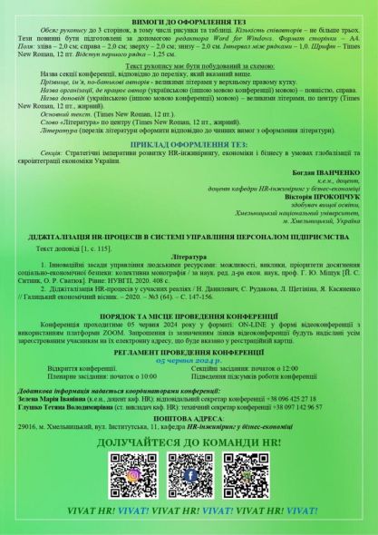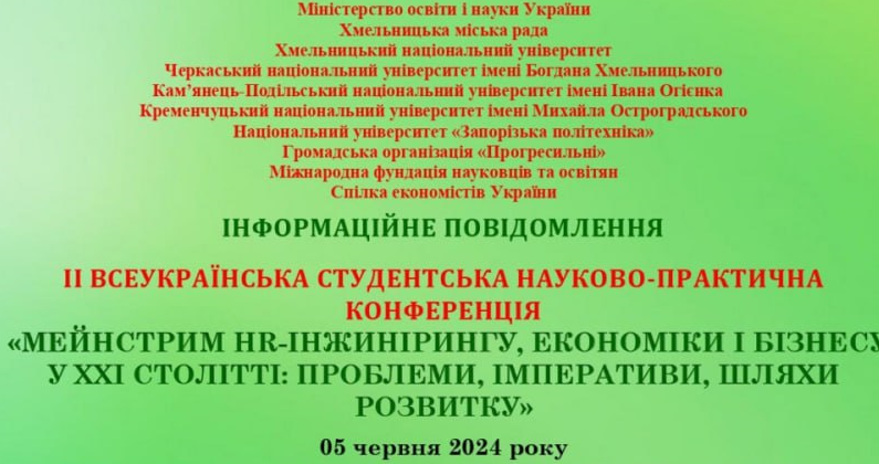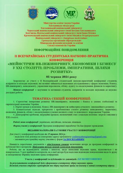 Запрошуємо студентів, аспірантів та молодих науковців, які активно займаються науковими дослідженнями у сферах економіки, бізнесу, HR-інжинірингу, менеджменту, управління персоналом, обліку, аудиту та оподаткування, фінансів та маркетингу взяти участь у ІІ Всеукраїнській студентській науково-практичній конференції «СТРАТЕГІЧНІ ІМПЕРАТИВИ РОЗВИТКУ HR-ІНЖИНІРИНГУ, ЕКОНОМІКИ І БІЗНЕСУ В УМОВАХ ГЛОБАЛІЗАЦІЇ ТА ЄВРОІНТЕГРАЦІЇ ЕКОНОМІКИ УКРАЇНИ».