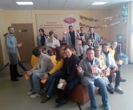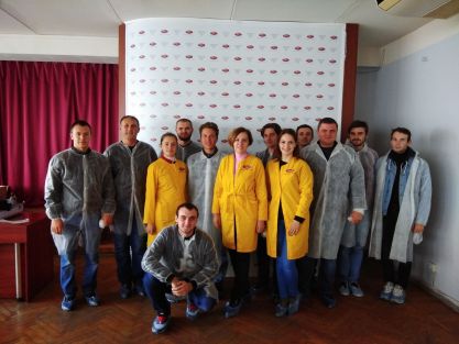 На фабриці досить галасно, тому екскурсовод Яресько Ірина Володимирівна розповіла про історію шоколаду і фабрики та спілкувалась з нашою групою через прилад гучного зв’язку. Варто відзначити ідеальну стерильність виробництва. Одягнувши бахіли, шапочки і довгі плащі студенти та викладачі познайомились у двох цехах з повним циклом виробництва цукерок «Труфальє» та «Королівський шарм». Технологічний процес виглядає таким чином: насамперед, кондитери використовують усі сировинні компоненти – молоко, цукрову пудру, какао, ароматизатори та інше – і готують начинку і глазур. Потім з готової маси формують корпус майбутньої цукерки. Після глазурування і охолодження продукт запаковують в обгортку, а після цього – в коробки. Особливу цікавість викликав процес загортання цукерок в етикетку. Одна машина упаковує до 1100 цукерок в хвилину! Обгортковий папір завантажується в машину рулонами, а на кінцевому етапі “хвостики” з двох сторін закручують спеціальні лапки. Виробництво значною мірою автоматизоване, за винятком лише деяких процесів, де вимагається ручна праця. Етапи виробництва не дозволяють фотографувати. Творці вважають за краще залишати в таємниці деякі тонкощі виготовлення. Під час ознайомлення з виробництвом студентам та викладачам запропонували продегустувати продукцію щойно виготовлених цукерок “Fruto banda”, а після закінчення екскурсії у залі для дегустації запропонували кондитерську продукцію компанії та дали по невеликому подарунку із зразками продукції фабрики.