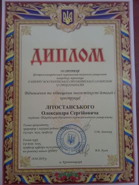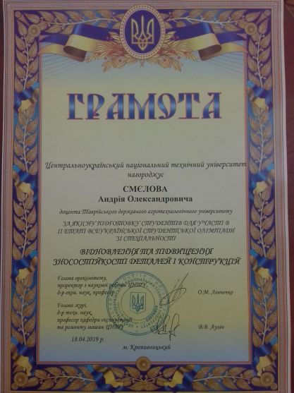 Студенти механіко-технологічного факультету прийняли участь і у ІІ етапі Всеукраїнської студентської олімпіади зі спеціальності «Відновлення та підвищення зносостійкості деталей і кострукцій». Олімпіада відбулась з 17 по 19 квітня на базі кафедри експлуатації та ремонту машин Центральноукраїнського національного технічного університету у м. Кропивницький. 3 тури олімпіади представляли різний формат завдань.