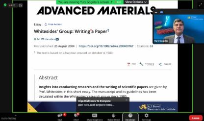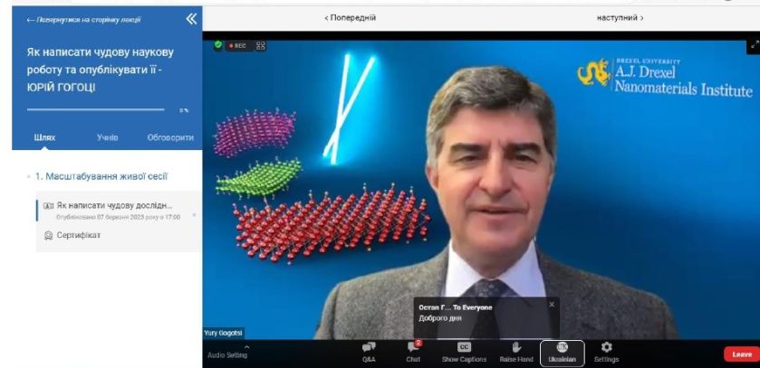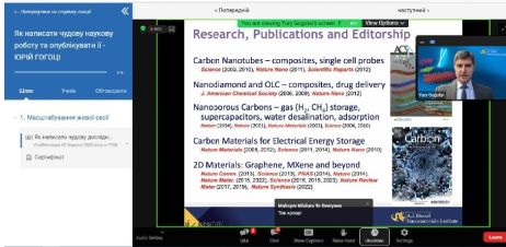 Координаторка проєкту Ukraine Global Faculty Ольга Рябцева на початку зустрічі представила слухачам доктора Гогоці як лектора, що близько двох десятиліть був редактором, асоційованим редактором та редактором фокусних випусків для багатьох наукових журналів, включаючи Carbon (Elsevier) та ACS Nano. Він опублікував численні статті в провідних журналах, включаючи Science і Nature.