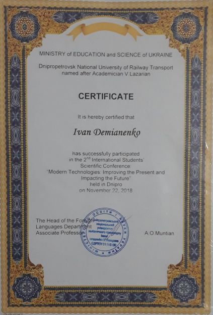 Іван отримав сертифікат учасника та запрошення на наступну конференцію, що планується навесні 2019 року.