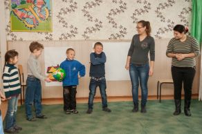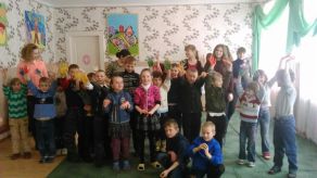 У цей час дівчата проводили розважальні ігри з молодшими дітками інтернату. Вони підготували багато цікавих ігр та загадок. Діти охоче брали участь у розважальній програмі та надзвичайно раділи подарункам.