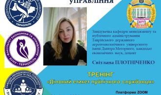 На запрошення Школи лідерів ефективного управління – Західноукраїнського національного університету в.о. завідувачки кафедри менеджменту та публічного адміністрування ТДАТУ Світлана Плотніченко провела тренінг на тему «Діловий етикет публічного службовця».