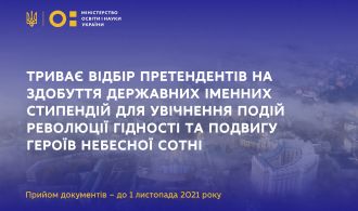 Триває відбір претендентів на здобуття державних іменних стипендій найкращим молодим вченим з метою увічнення подій Революції Гідності та вшанування подвигу Героїв України – Героїв Небесної Сотні. Прийом документів триватиме до 1 листопада 2021 року.