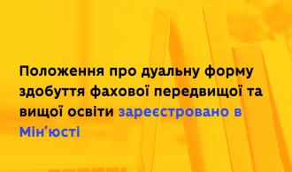 Міністерством юстиції України зареєстровано наказ Міністерства освіти і науки України від 13 квітня 2023 року № 426, який затверджує Положення про дуальну форму здобуття фахової передвищої та вищої освіти.