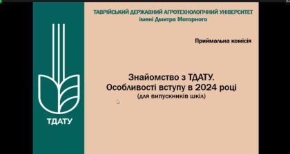 9 квітня Таврійський державний агротехнологічний університет імені Дмитра Моторного, за ініціативи Департаменту освіти Запорізької ОДА, для вступників 2024 року провів пізнавальний інтерактивний захід «Таврійський ДАТУ: перше знайомство».
