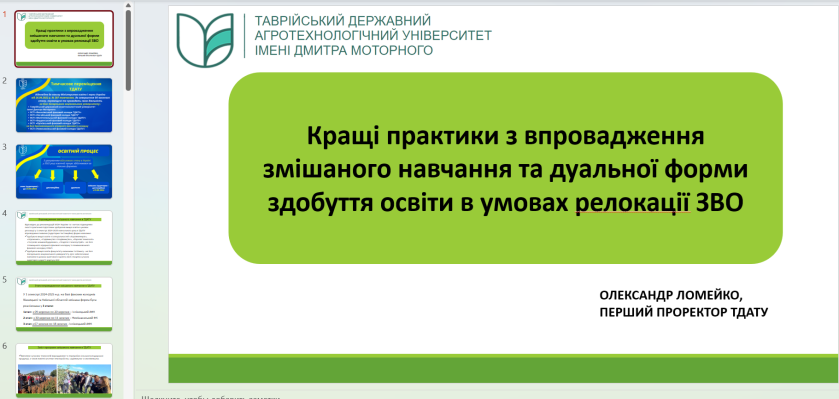 Таврійський державний агротехнологічний університет імені Дмитра Моторного на конференції представляв перший проректор Олександр Ломейко. У свої доповіді він презентував кращі практики із впровадження змішаного навчання та дуальної форми здобуття освіти в умовах релокації ЗВО, яким на сьогодні є ТДАТУ.