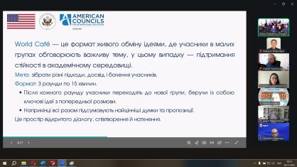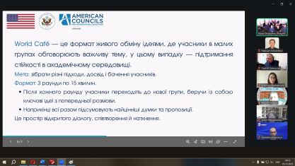 У форматі інтерактивної сесії Q&A та World Café учасники обговорили шляхи збереження стійкості в академічному середовищі. Представники університетів презентували антикризові стратегії, моделі управління ризиками, механізми підтримки академічної автономії та співпраці з міжнародними партнерами. Також порушувалися питання створення безпечного й інклюзивного середовища для внутрішньо переміщених студентів і працівників, дотримання принципів академічної доброчесності та використання цифрових інструментів у викладанні й дослідженнях.