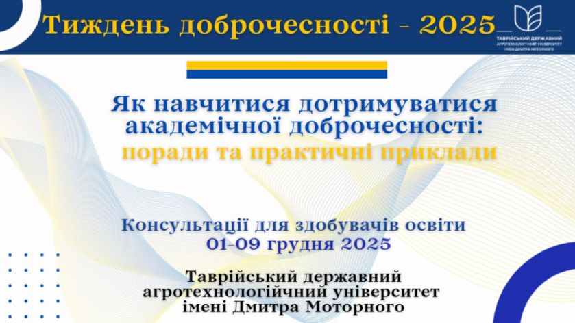 Таврійський державний агротехнологічний університет імені Дмитра Моторного активно долучився до заходів Тижня доброчесності, ініційованого Національним агентством з питань запобігання корупції (НАЗК). Загальноукраїнська кампанія тривала з 01 по 09 грудня 2025 року та була спрямована на формування культури доброчесності серед студентської молоді.