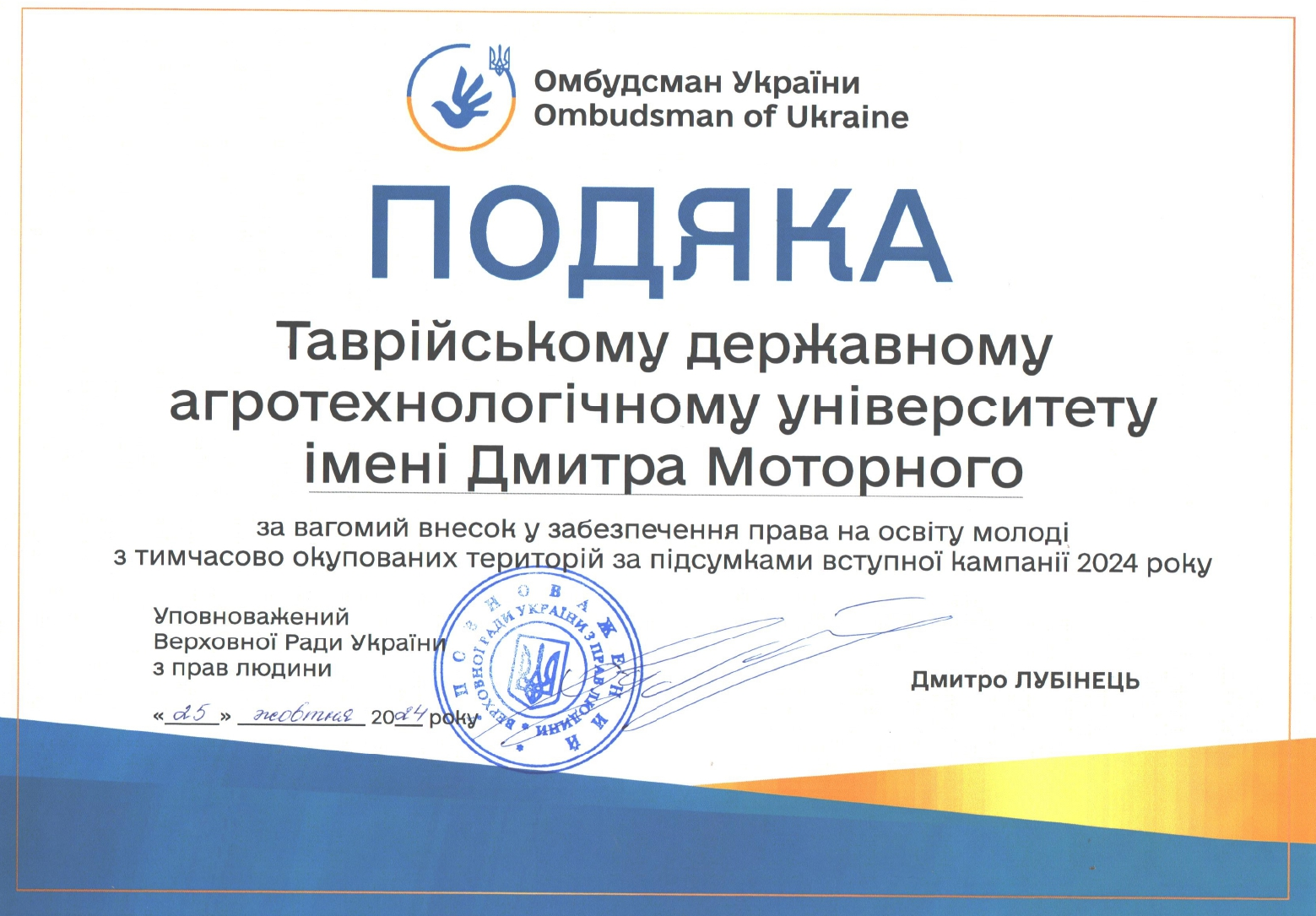 ТДАТУ отримав Подяку Уповноваженого Верховної Ради України з прав людини