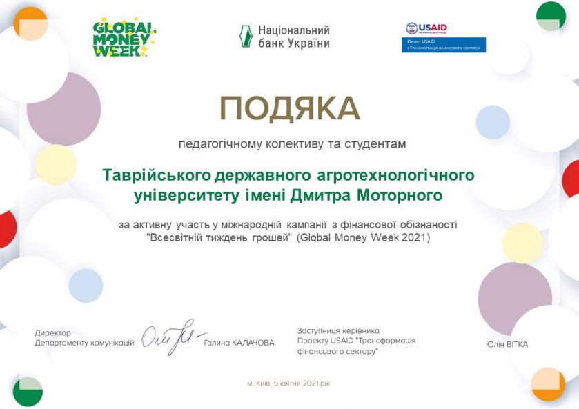 За результатами просвітницької кампанії, Таврійський державний агротехнологічний університет імені Дмитра Моторного отримав від Національного банку України подяку за активну участь у міжнародній кампанії з фінансової обізнаності «Всесвітній тиждень грошей».