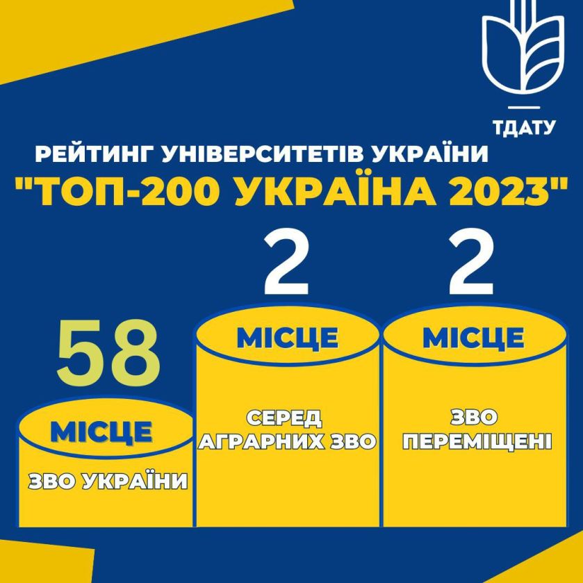 ТДАТУ – беззмінний лідер серед аграрних ЗВО України – 2 місце (1 – посідає НУБІП). Серед переміщених ЗВО Таврійський ДАТУ також посідає 2 місце.