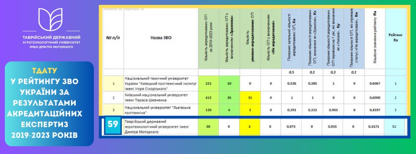 ТДАТУ у рейтингу ЗВО України за результатами акредитаційних експертиз 2019-2023 років