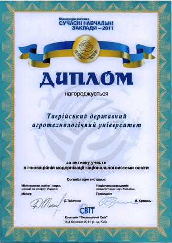 ТДАТУ було відзначено Дипломом «За активну участь у інноваційній модернізації національної системи освіти».