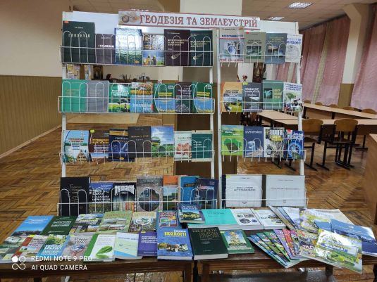 На виставці представлені навчальні посібники: В. Грабовий «Геодезія», С. Вилка «Інженерна геодезія», «Геодезія» за редакцією В. Горлачука, А. Третяк «Землеустрій», «Оцінка земель» за редакцією М. Ступеня, «Землевпорядне проектування» за редакцією А. Третяка.