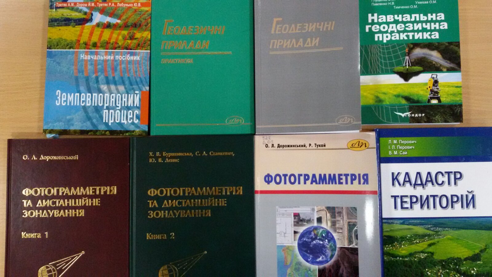 На виставці представлені навчальні посібники: В. Грабовий «Геодезія», С. Вилка «Інженерна геодезія», «Геодезія» за редакцією В. Горлачука, А. Третяк «Землеустрій», «Оцінка земель» за редакцією М. Ступеня, «Землевпорядне проектування» за редакцією А. Третяка.