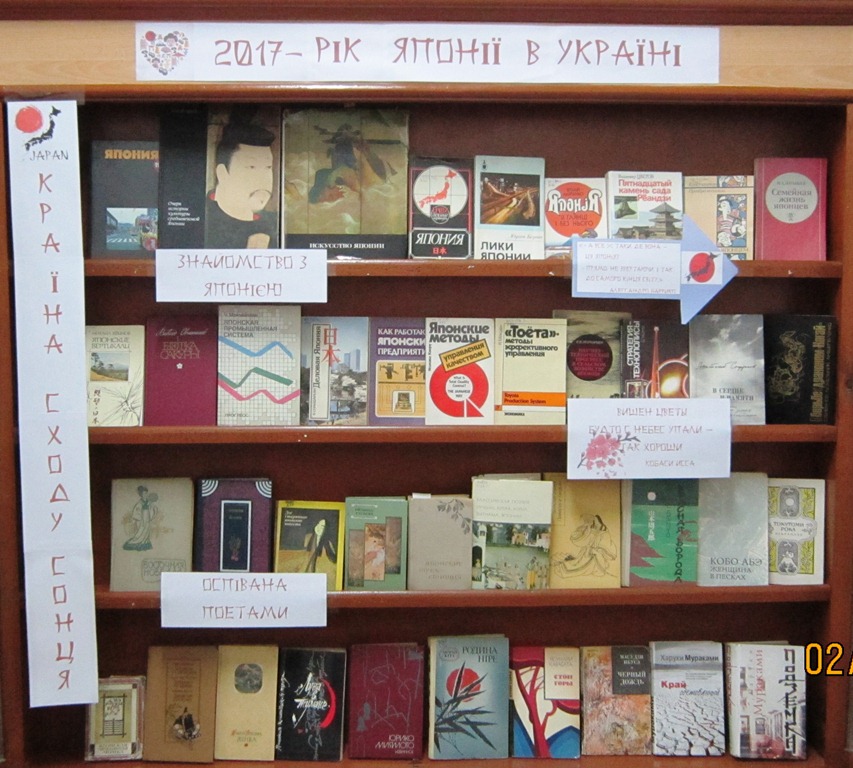 2017 рік за ініціативою Президента України оголошено роком Японії в Україні. До цієї події на першому поверсі наукової бібліотеки демонструється тематична виставка «Країна сходу сонця». На виставці представлені книги, які розкривають традиції, економічний та технічний розвиток цієї східної країни та твори великих майстрів японської художньої літератури.