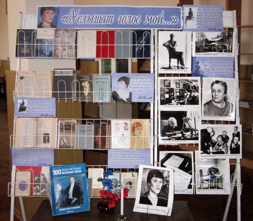 До 130-річчя від дня народження Анни Ахматової, наукова бібліотека в рамках проекту «Теплі історії в бібліотеці» провела літературну годину «Анна Ахматова… А ще називають музою…». До заходу була підготовлена виставка-інсталяція «Услышат голос мой».