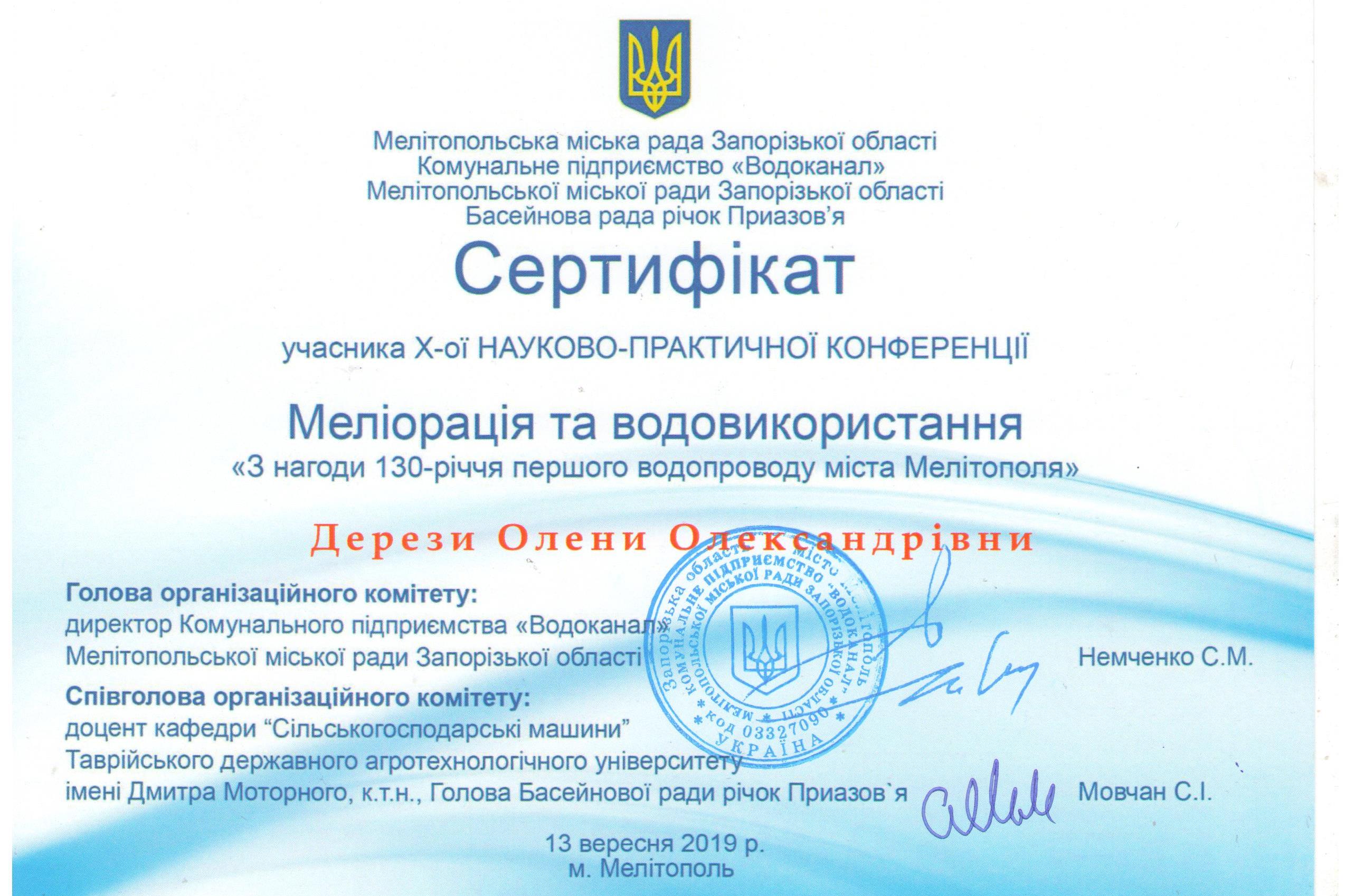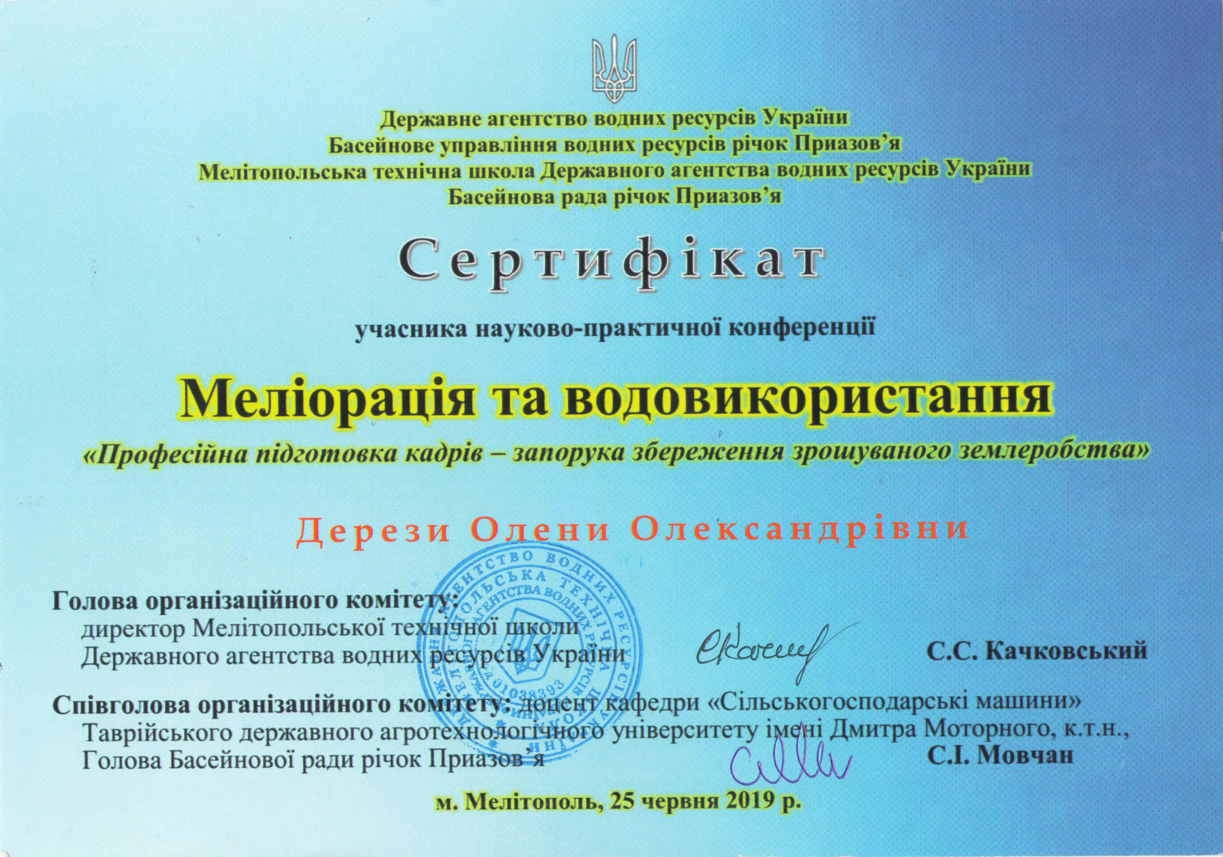 25 червня 2019 року за ініціативи Державного агентства водних ресурсів України, Басейновового управління водних ресурсів річок Приазов’я, Мелітопольської технічної школи, Державного агентства водних ресурсів України та Басейнової рада річок Приазов’я проводилась ІХ науково-практична конференція «Меліорація та водовикористання»: професійна підготовка кадрів – запорука збереження зрошуваного землеробства. В роботі конференції прийняли участь викладач кафедри технічної механіки Дереза О.О. з доповіддю «Нестача питної води в посушливих регіонах України» (робоча програма, сертифікат)