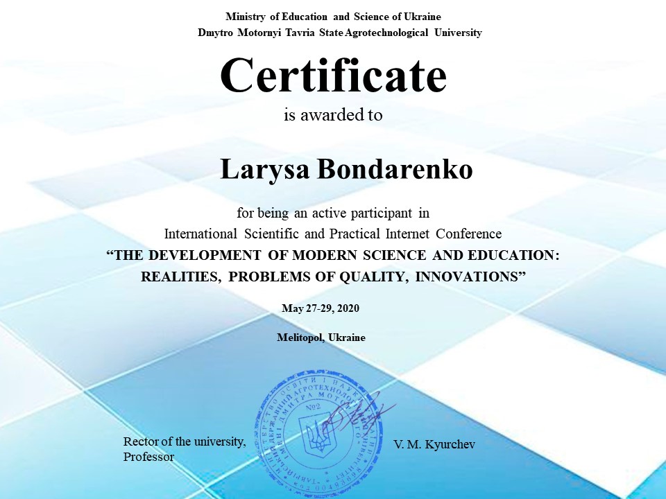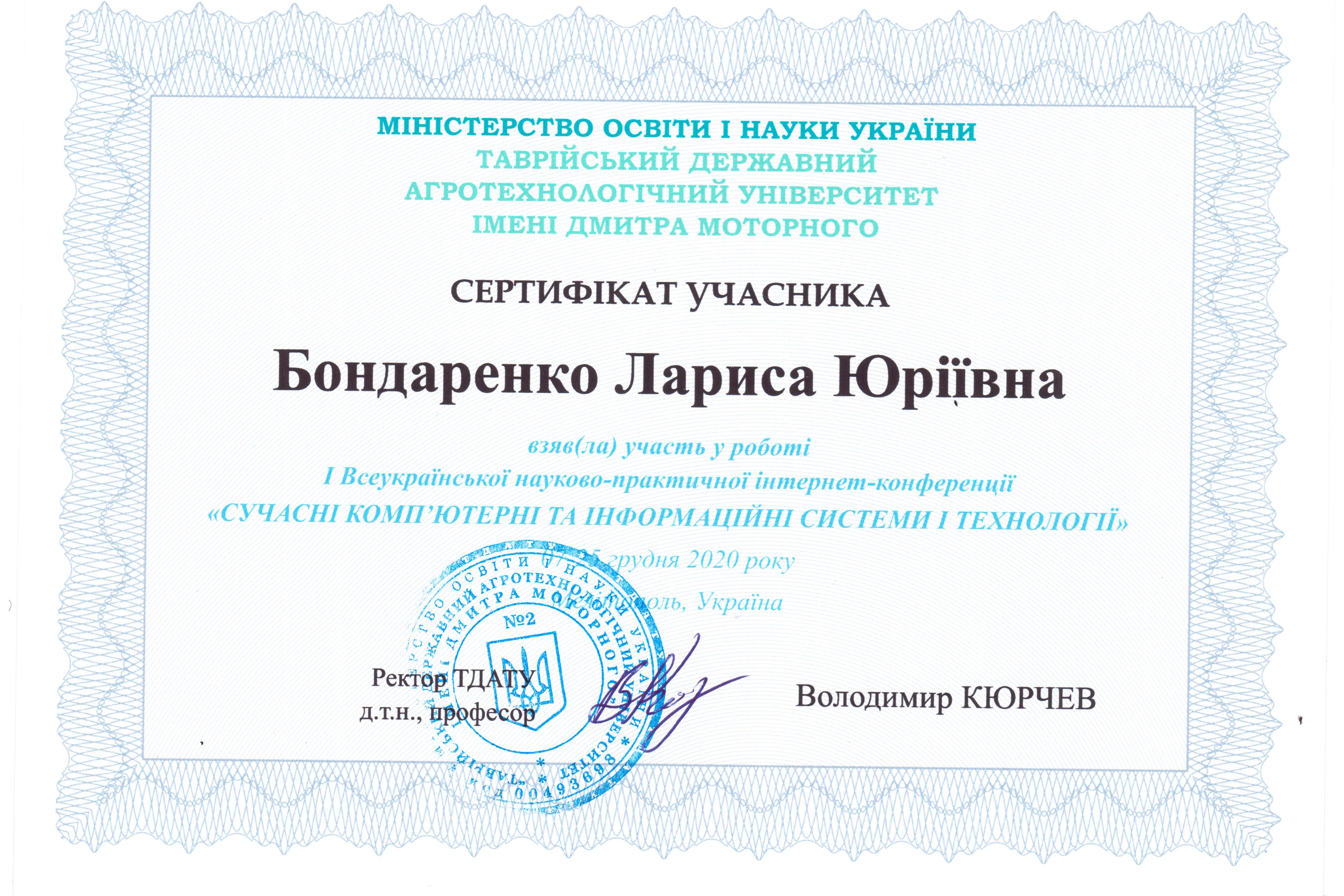 З 26 по 27 грудня 2019 року на базі Таврійського державного агротехнологічного університету імені Дмитра Моторного, м. Мелітополь відбулась ІІ Міжнародна науково-практична конференція «Сучасні шляхи розвитку сільськогосподарського виробництва: тенденції та інновації». Серед організаторів конференції була доцент кафедри «Техніна механіка та компютерне проектування імені проф. В.М. Найдиша» Бондаренко Л.Ю.