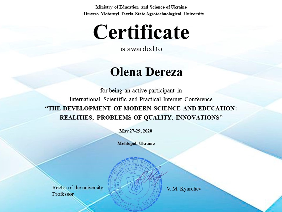17-18 травня 2021 року в навчально-науковому інституті механотроніки і систем менеджменту Харківського національного технічного університету сільського господарства імені Петра Василенка проходила Міжнародна науково-практична конференція «МОЛОДЬ І ТЕХНІЧНИЙ ПРОГРЕС В АПВ».(програма). В роботі конференції активну участь прийняла доц. Дереза О.О (сертифікат)