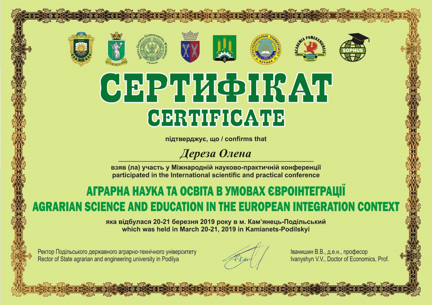 20-21 березня 2019 року проводилась Міжнародна науково-практична конференція/participated in the International scientific and practical conference АГРАРНА НАУКА ТА ОСВІТА В УМОВАХ ЄВРОІНТЕГРАЦІЇ. Активними учасниками заходу були доценти кафедри ТМ Дереза О.О.(сертифікат) та Коломієць С.М. (сертифікат).