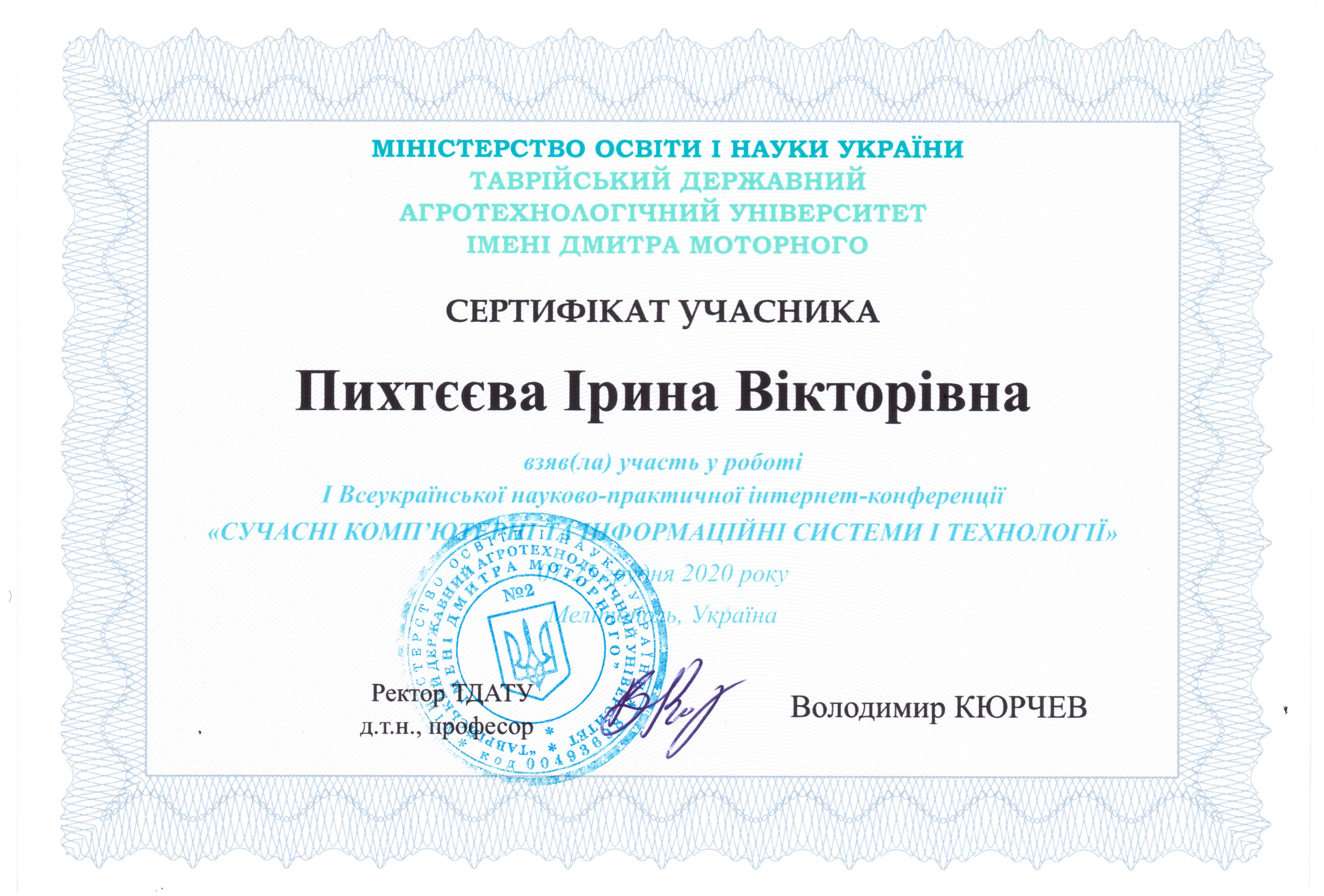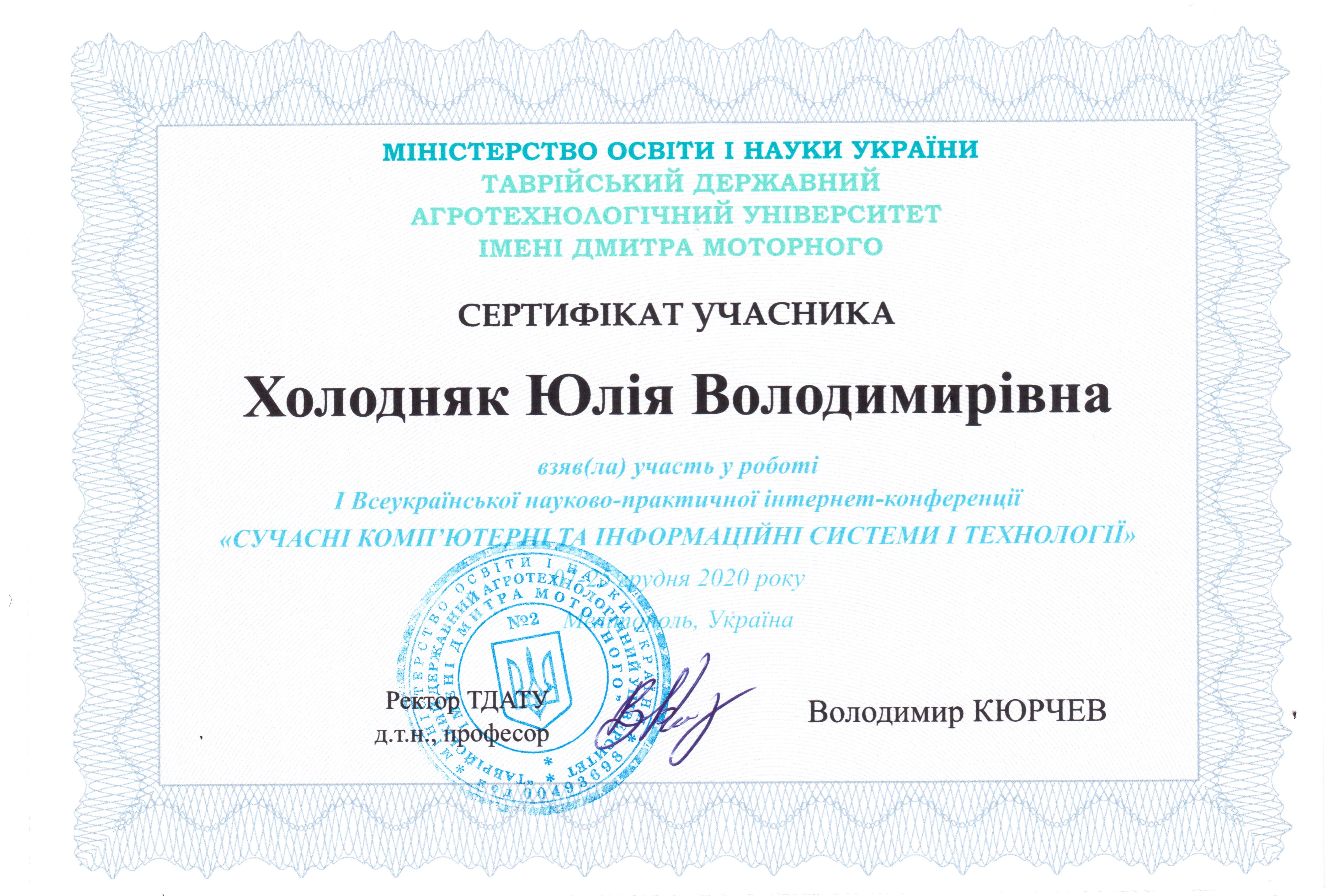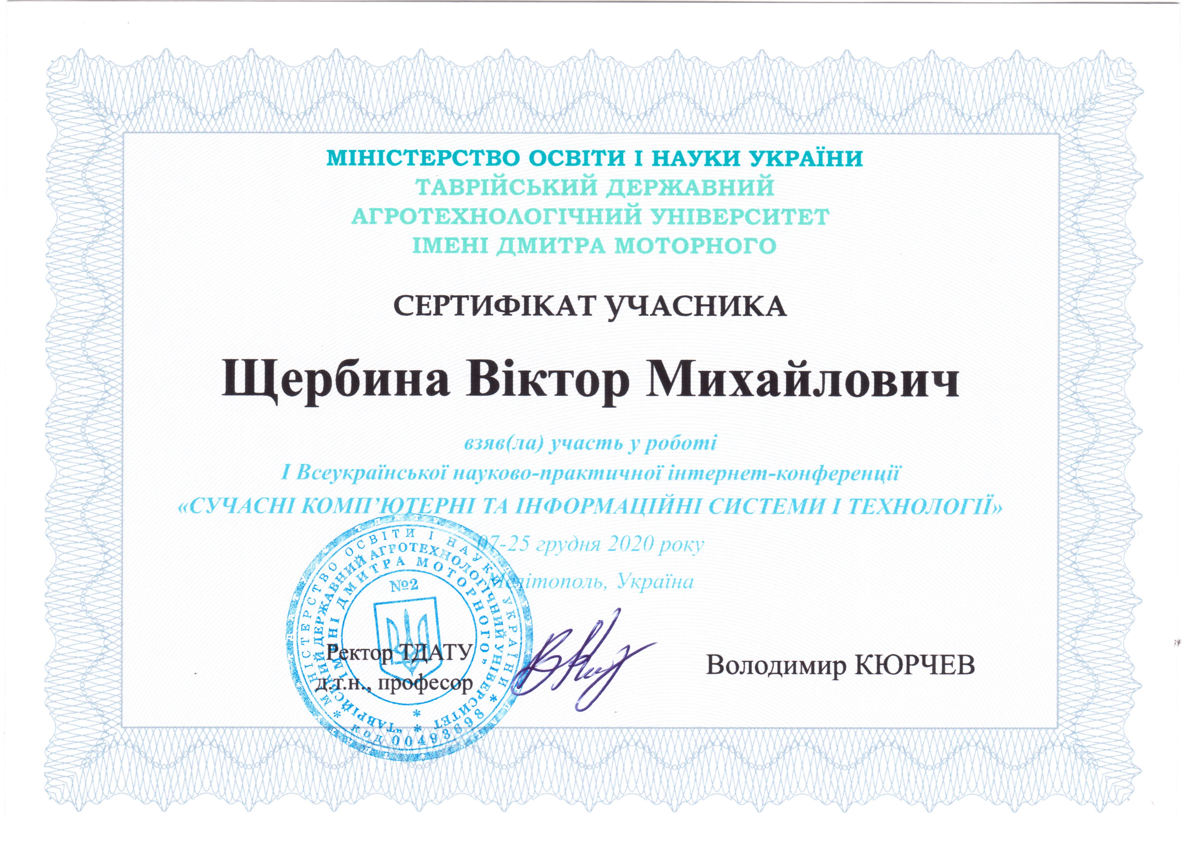 З 7.12.2020 по 25.12.2020 р. У Таврійському державному агротехнологічному університеті імені Дмитра Моторного на базі кафедри «Комп’ютерні науки» відбулася І Всеукраїнська науково-практична інтернет-конференція «СУЧАСНІ КОМП’ЮТЕРНІ ТА ІНФОРМАЦІЙНІ СИСТЕМИ І ТЕХНОЛОГІЇ». Мета конференції – зібрати лідерів у галузі інформаційних технологій з усієї країни. Активну участь в поданні матеріалів та їх обговоренні на форумі конференції прийняли викладачі кафедри «Технічна механіка та комп’ютерне проектування імені професора В.М Найдиша»: д.т.н., проф. Леженкін О.М. (сертифікат), к.т.н., доц. Бондаренко Л.Ю. (сертифікат), к.т.н., доц. Гавриленко Є.А. (сертифікат), к.т.н., доц. Івженко О.В. (сертифікат), к.т.н., доц. Пихтєєва І.В. (сертифікат), к.т.н., доц. Щербина В.М. (сертифікат), к.т.н., ст. викл. Холодняк Ю.В. (сертифікат). За результатами роботи конференції видано Матеріали конференції.