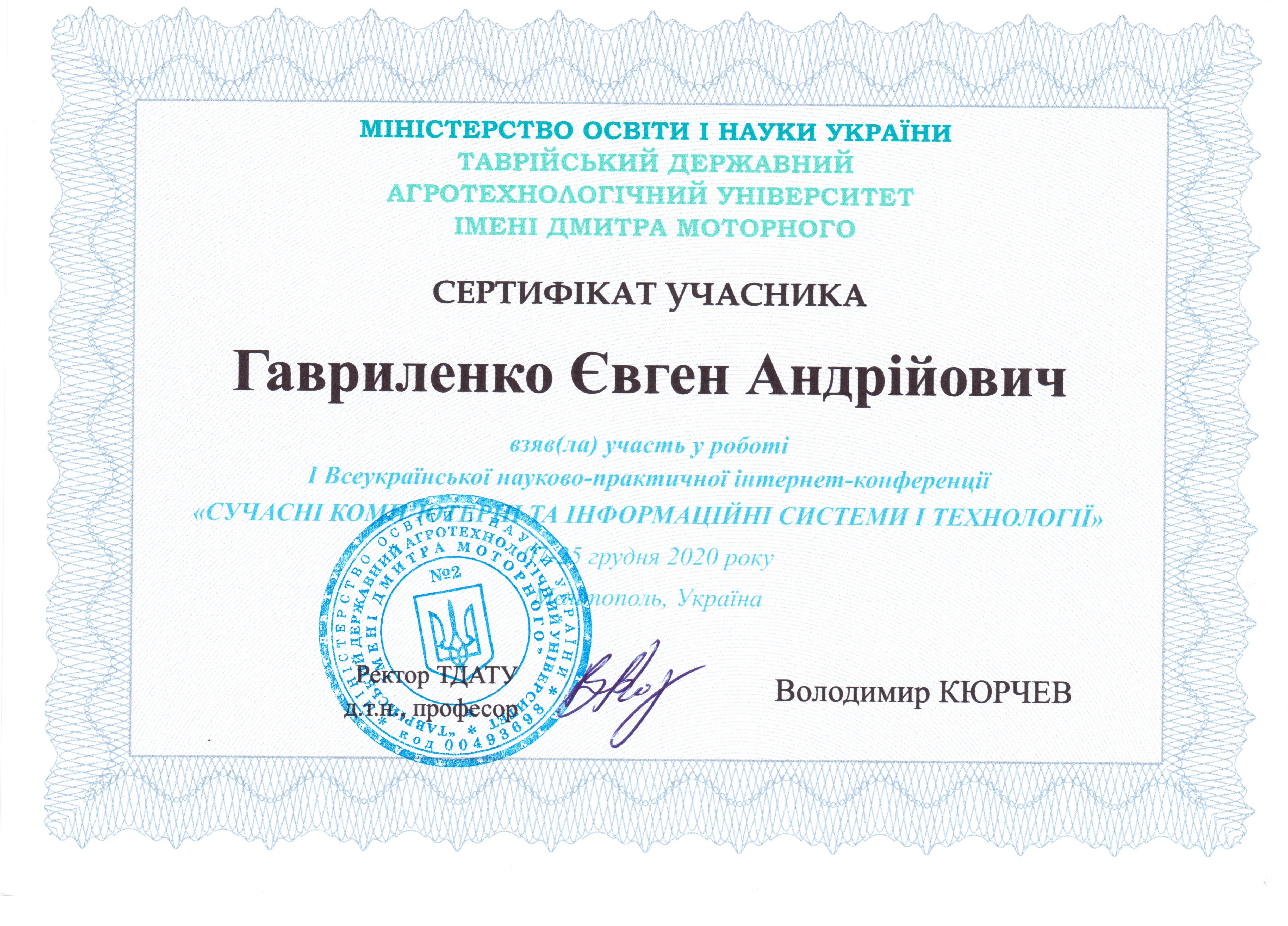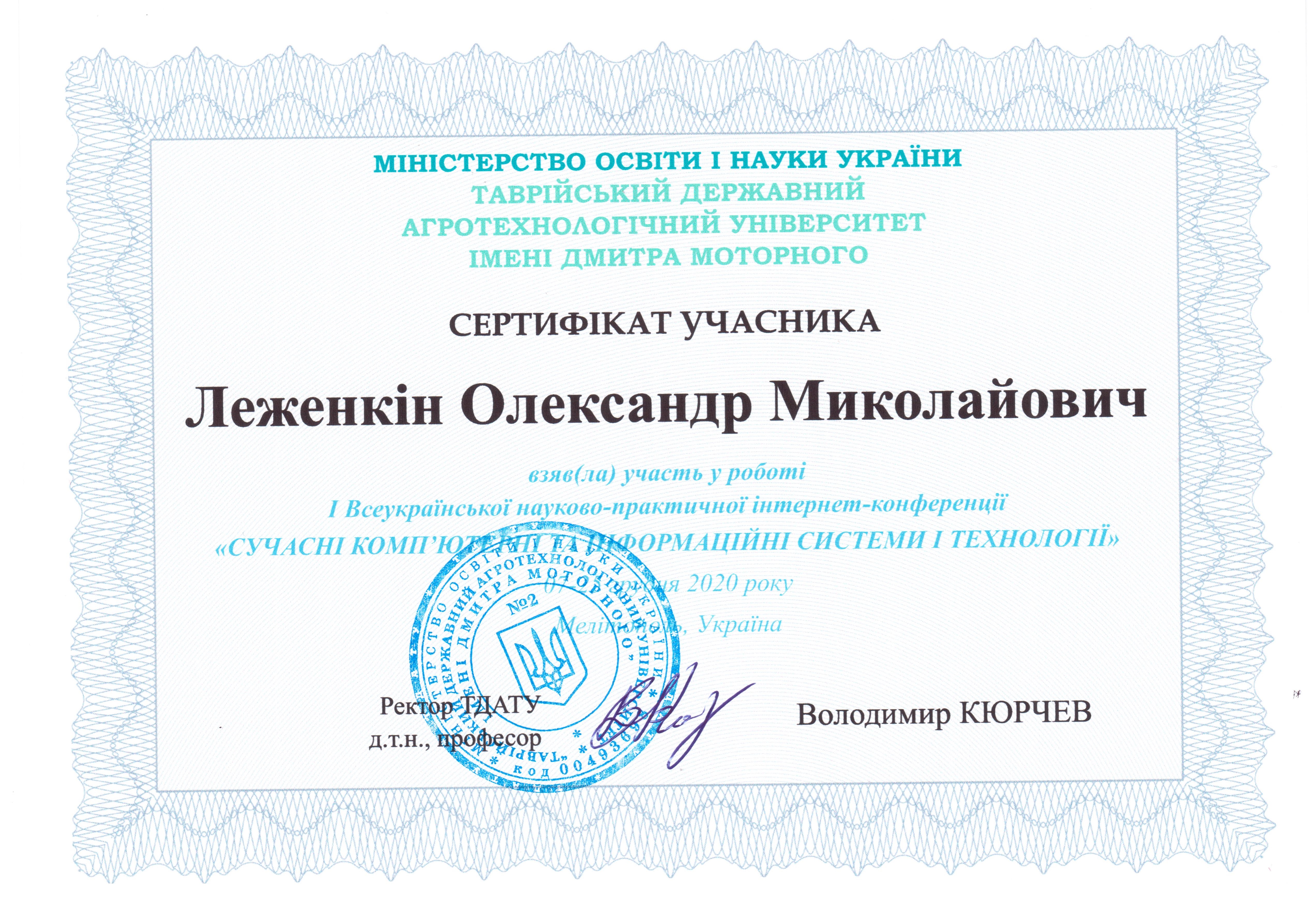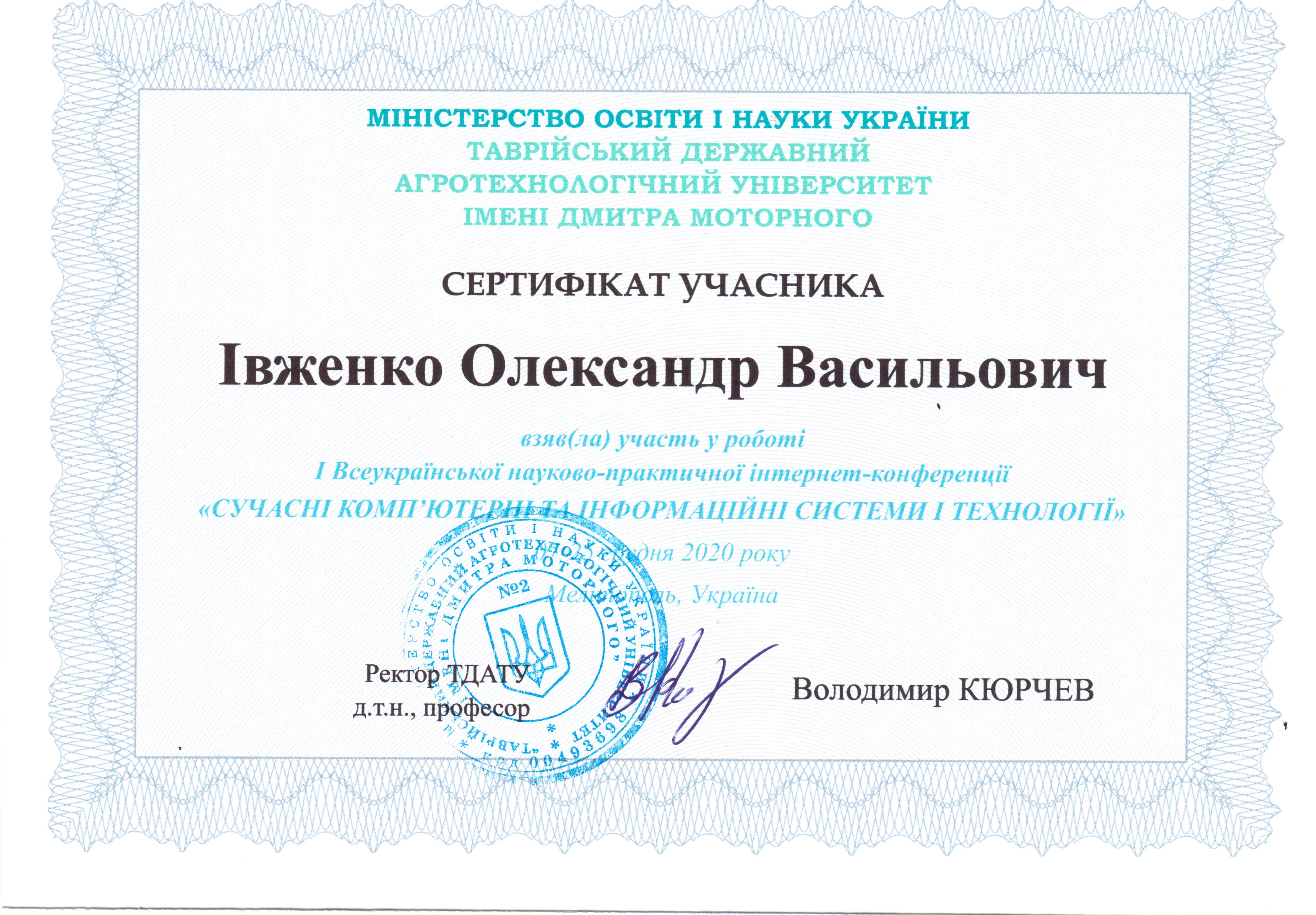 З 7.12.2020 по 25.12.2020 р. У Таврійському державному агротехнологічному університеті імені Дмитра Моторного на базі кафедри «Комп’ютерні науки» відбулася І Всеукраїнська науково-практична інтернет-конференція «СУЧАСНІ КОМП’ЮТЕРНІ ТА ІНФОРМАЦІЙНІ СИСТЕМИ І ТЕХНОЛОГІЇ». Мета конференції – зібрати лідерів у галузі інформаційних технологій з усієї країни. Активну участь в поданні матеріалів та їх обговоренні на форумі конференції прийняли викладачі кафедри «Технічна механіка та комп’ютерне проектування імені професора В.М Найдиша»: д.т.н., проф. Леженкін О.М. (сертифікат), к.т.н., доц. Бондаренко Л.Ю. (сертифікат), к.т.н., доц. Гавриленко Є.А. (сертифікат), к.т.н., доц. Івженко О.В. (сертифікат), к.т.н., доц. Пихтєєва І.В. (сертифікат), к.т.н., доц. Щербина В.М. (сертифікат), к.т.н., ст. викл. Холодняк Ю.В. (сертифікат). За результатами роботи конференції видано Матеріали конференції.