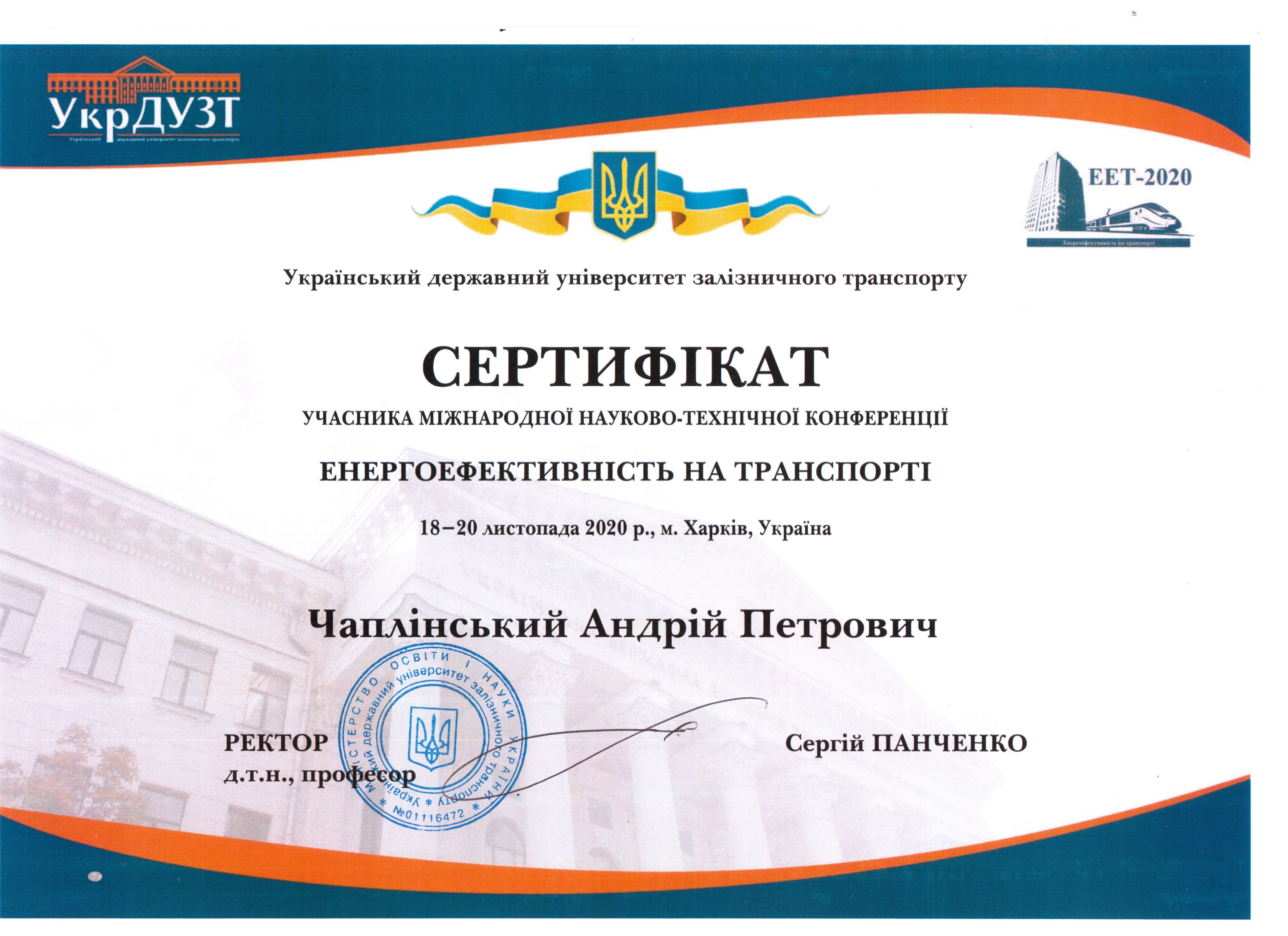 18-20 листопада 2020 року в Українському державному університеті залізничного транспорту (м. Харків) проходила міжнародна науково-технічна конференція «Енергоефективність на транспорті». В роботі секції «РЕСУРСО- ТА ЕНЕРГОЗБЕРЕЖЕННЯ НА ТРАНСПОРТІ» прийняв участь старший викладач кафедри «Технічна механіка та комп’ютерне проектування імені професора В.М. Найдиша» Андрій Чаплінський з доповіддю «Шляхи підвищення тягового ККД модульного тягового засобу» (сертифікат)