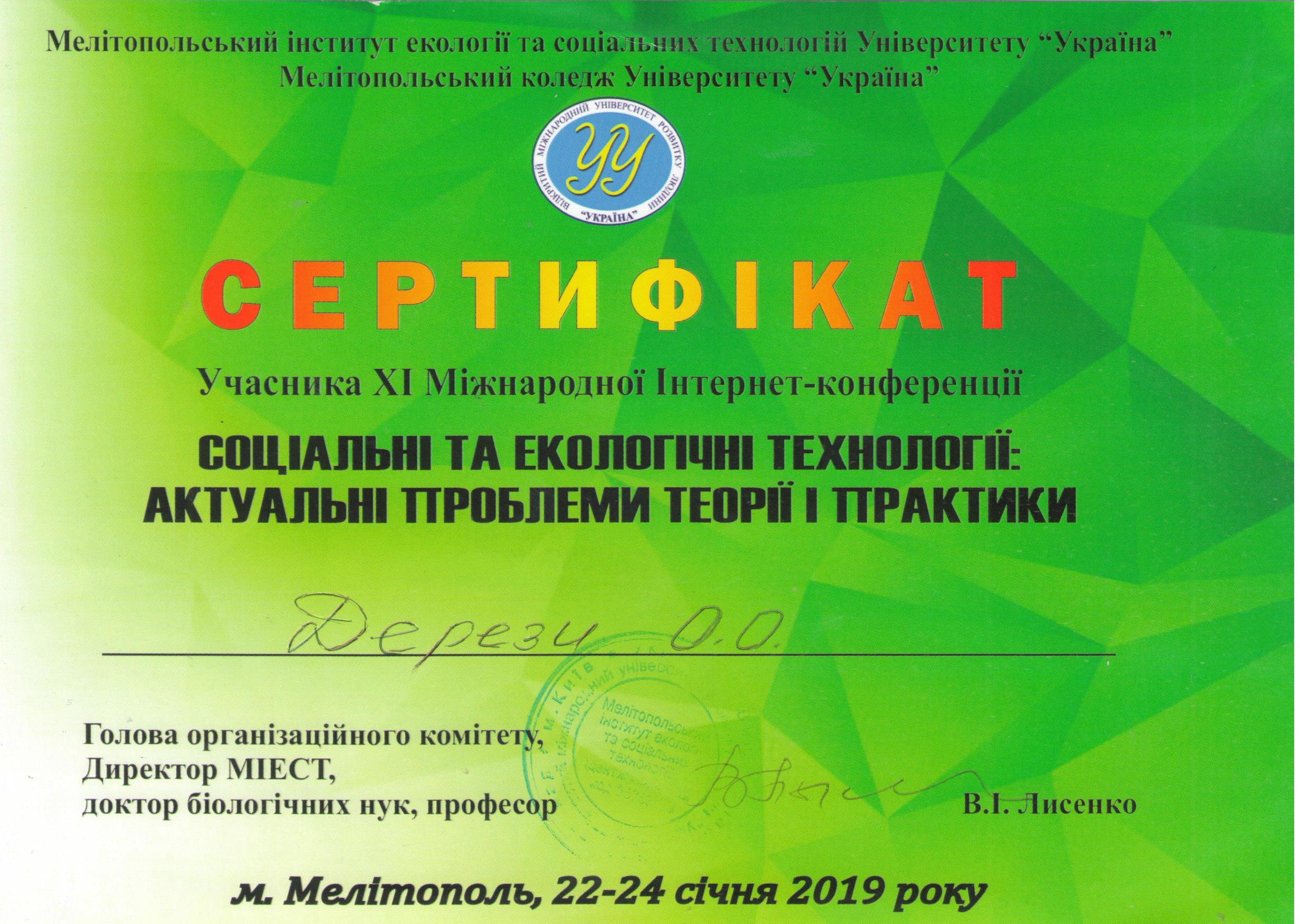 З 22 по 24 січня 2019 року проводилась XІ міжнародна інтернет-конференція «Соціальні та екологічні технології: актуальні проблеми теорії і практики». Учасником заходу була к.т.н., доц. кафедри ТМ Дереза О.О. (сертифікат)