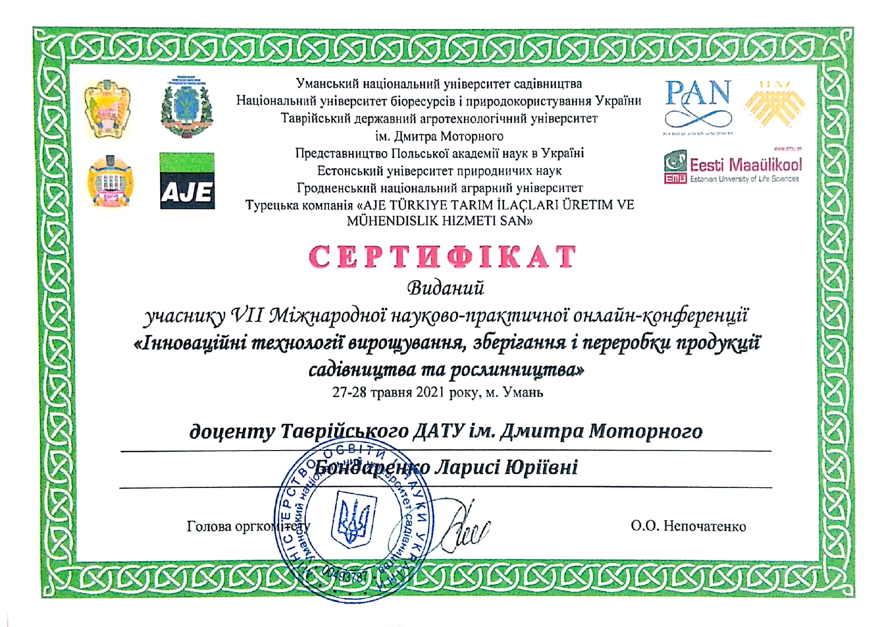 27-28 травня 2021 року, на базі інженерно-технологічного факультету Уманського національного університету садівництва відбулася VІІ Міжнародна науково-практична конференція «Інноваційні технології вирощування, зберігання і переробки продукції садівництва та рослинництва». На пленарному засіданні, серед інших, було заслухано доповідь доцента кафедри ТМКП Бондаренко Лариси Юріївни на тему «ПІДВИЩЕННЯ ЕФЕКТИВНОСТІ ВИКОРИСТАННЯ ВІДХОДІВ ПЛОДОВОЇ ДЕРЕВИНИ». (сертифікат)