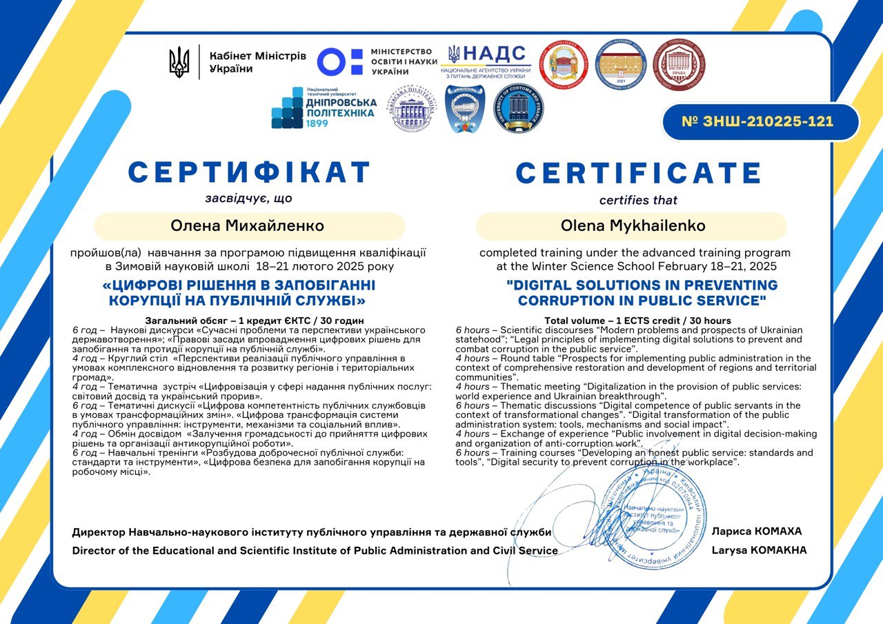 - Сертифікат про підвищення кваліфікації Зимової наукової школи 18-25 лютого 2025 року «Цифрові рішення в запобіганні корупції на публічній службі»