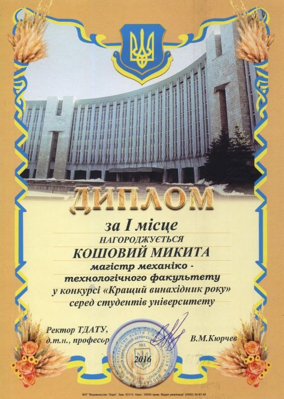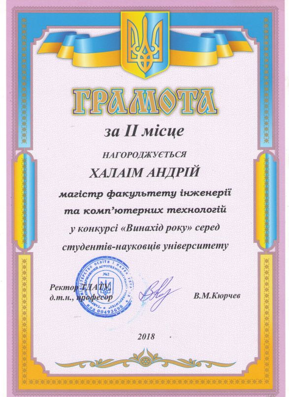 9. Грамота за 2 місце, нагороджується Халіам Андрій, у конкурсі “Винахідник року” Серед студентів університету