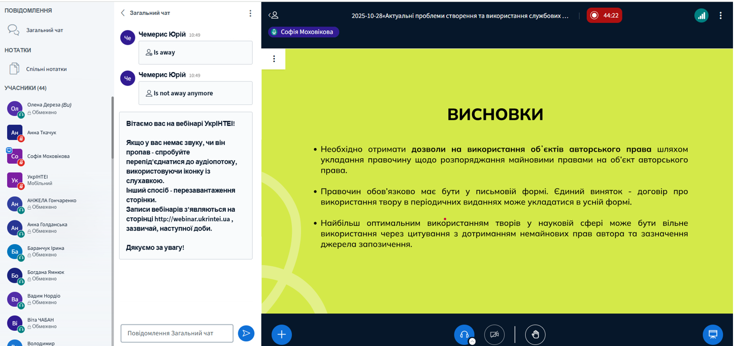 У межах семінару спікерка Софія МОХОВІКОВА, провідний професіонал з інтелектуальної власності відділу розвитку креативних секторів економіки УКРНОІВІ доповіла про особливості правового статусу службових об’єктів права інтелектуальної власності у вищій школі. Тема доповіді: «Авторське право в закладах вищої освіти та наукових установах: об’єкти, їх правомірне створення та успішна комерціалізація».